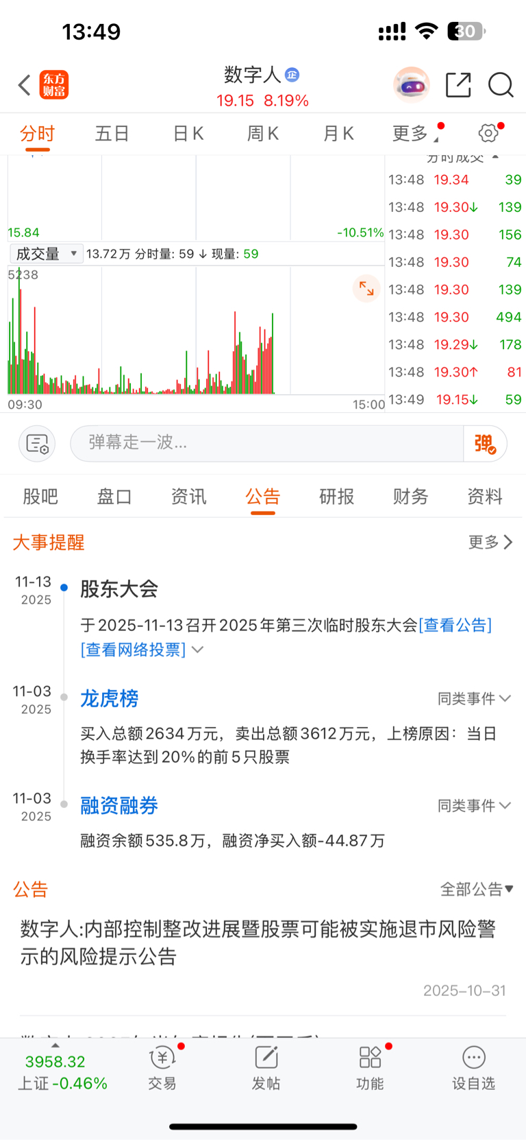 你的利空公告不够啊,散户不认账啊。你看我数字人发退市风险预告就很厉害啊。今天就大