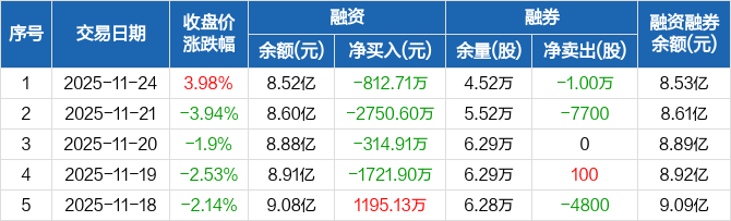 融资方面,当日融资买入3212.44万元,融资偿还4025.15万元,融资净偿还812.71万元,连续4日净偿还累计5600.13万元。融券方面,融券卖出0股,融券偿还1万股,融券余量4.52万股,融券余额76.84万元。融资融券余额合计8.53亿元。