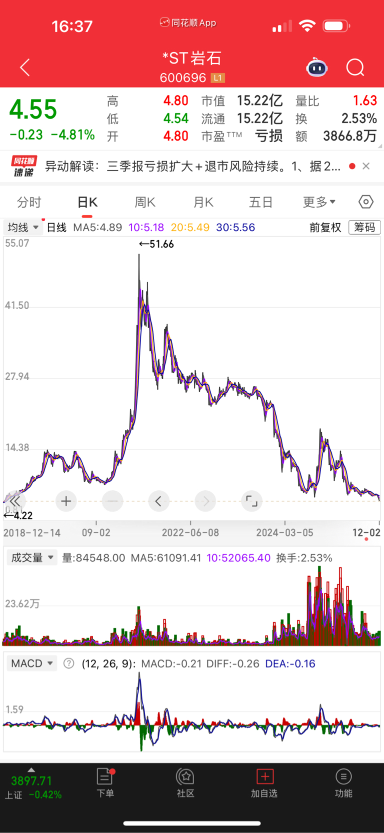 50多跌到4元多,还有st立方退和赢时胜走势更加相似。非唱空,今天16.42买了