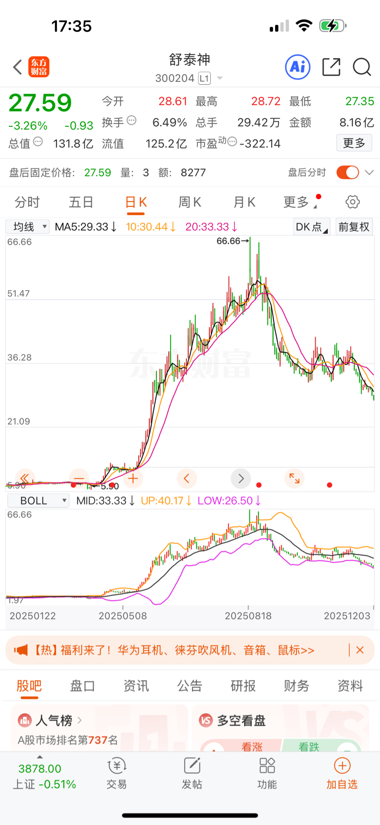 全部原理一样,本来才4.33元多,炒到40多,一地鸡毛。10倍了,舒泰神也是一直