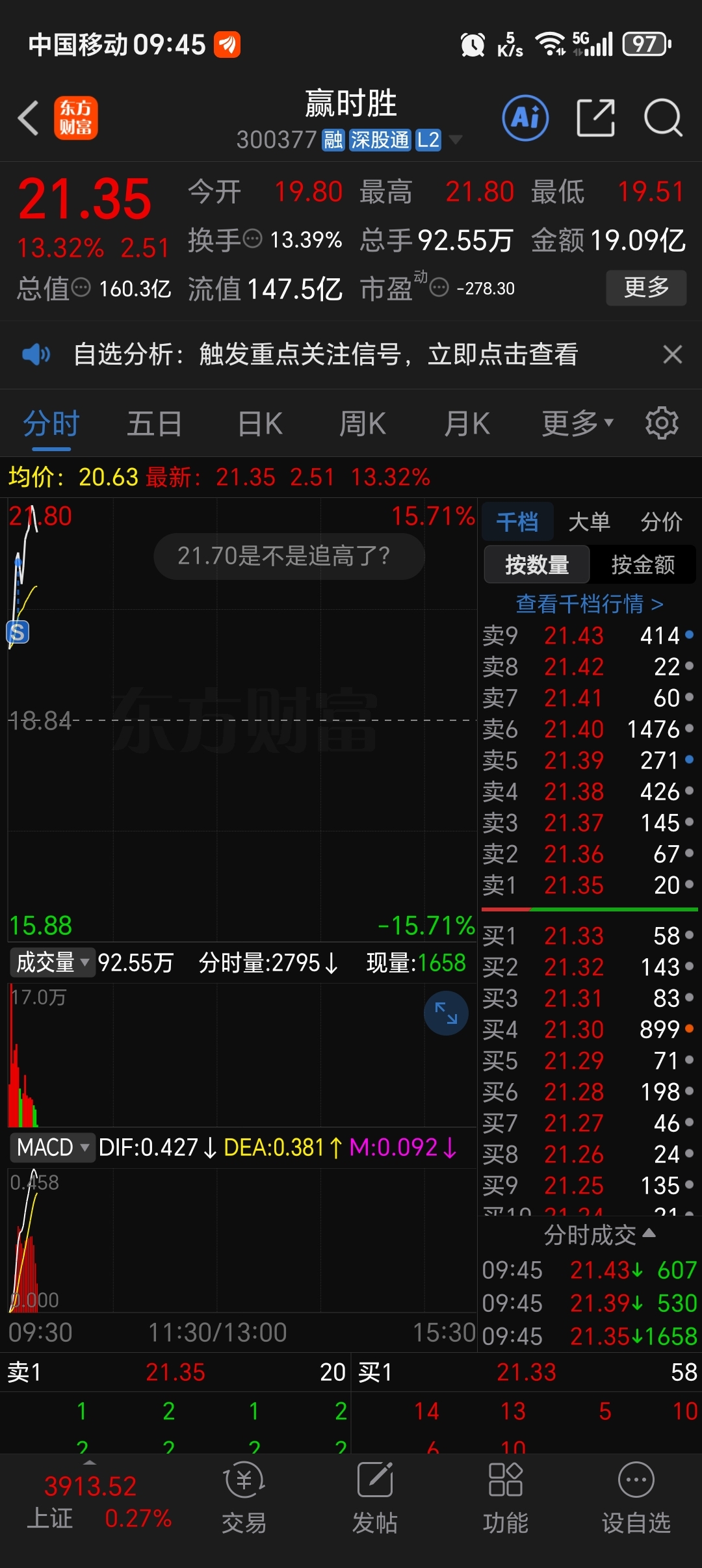 $赢时胜(SZ300377)$ 恭喜周五上车的朋友,啃了20点我先撤了你们赚吧