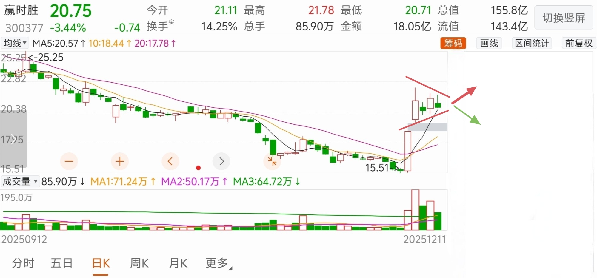 今天依旧在5日线上方盘整,受大盘影响,虽然回落的有点多,好在形态保持得还不错,低点越来越高,高点越来越低,形成一个三角旗型。明天很关键,根据5日均线的预测,假如明天的开盘价在今天的收盘价上,那5日均线将在20.97元上,所以说,如果明天开盘以后不能持续去上攻21元,那这股大概率会回踩下方缺口,形势不妙,如果明天能高开持续向上,那新一波趋势就将打开,过多的焦虑没用,明天见分晓吧!希望明天券商能来护护盘,那这股也会跟着向上走一走的。