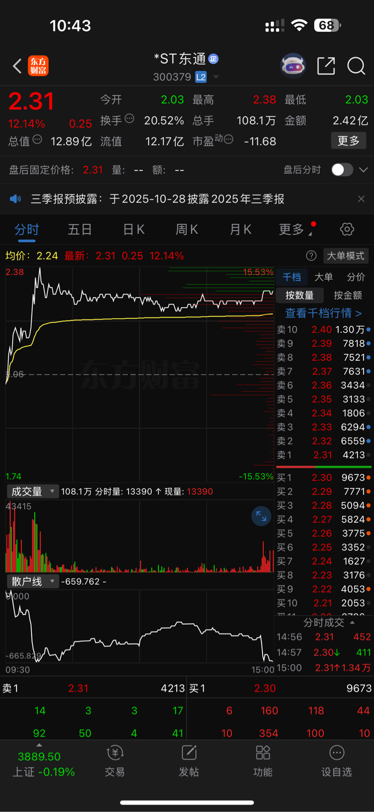 $*ST东通(SZ300379)$ 1.34万都没卖完???这位置出货太多了明天低开五个点至少!