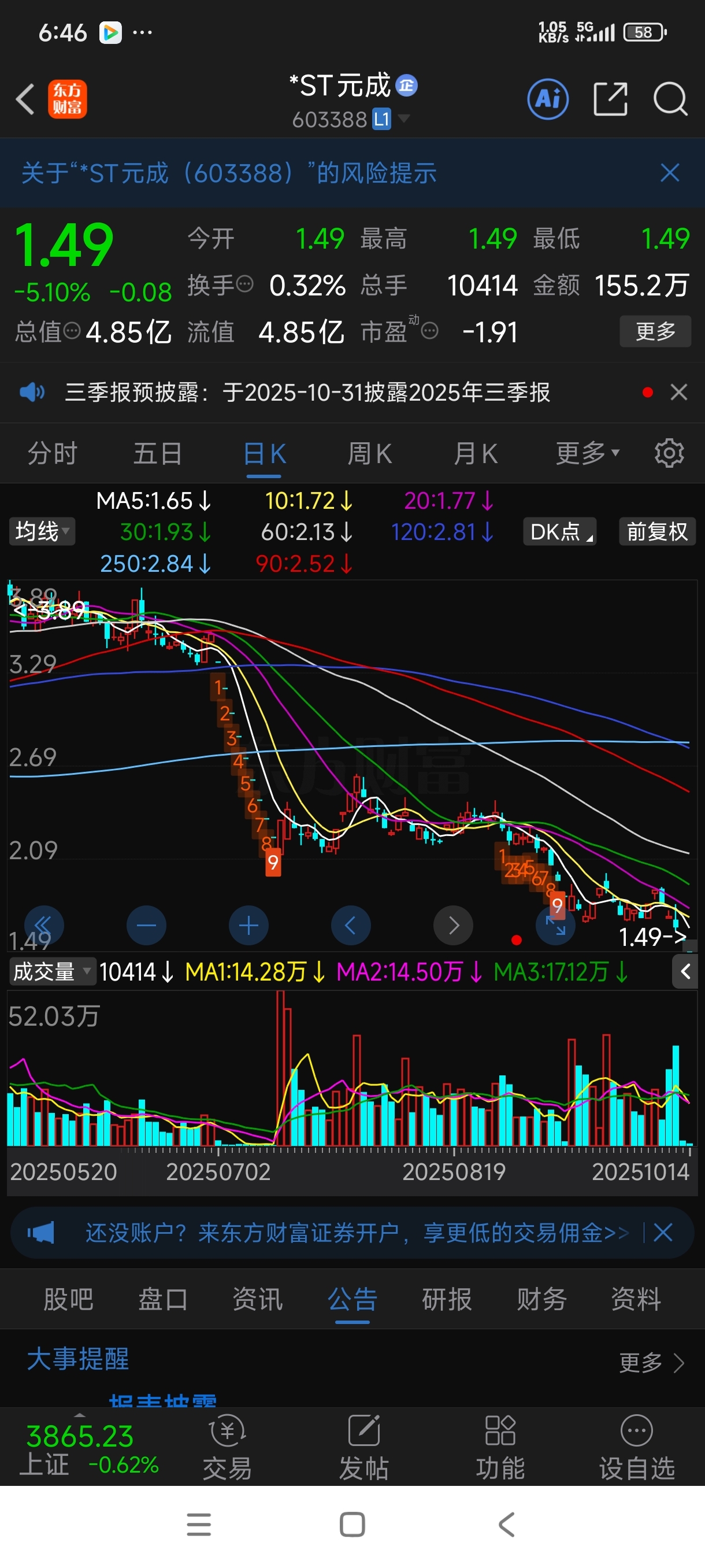 ST元成事先告知书后连续跌停,面临市值低于5亿终止上市风险。