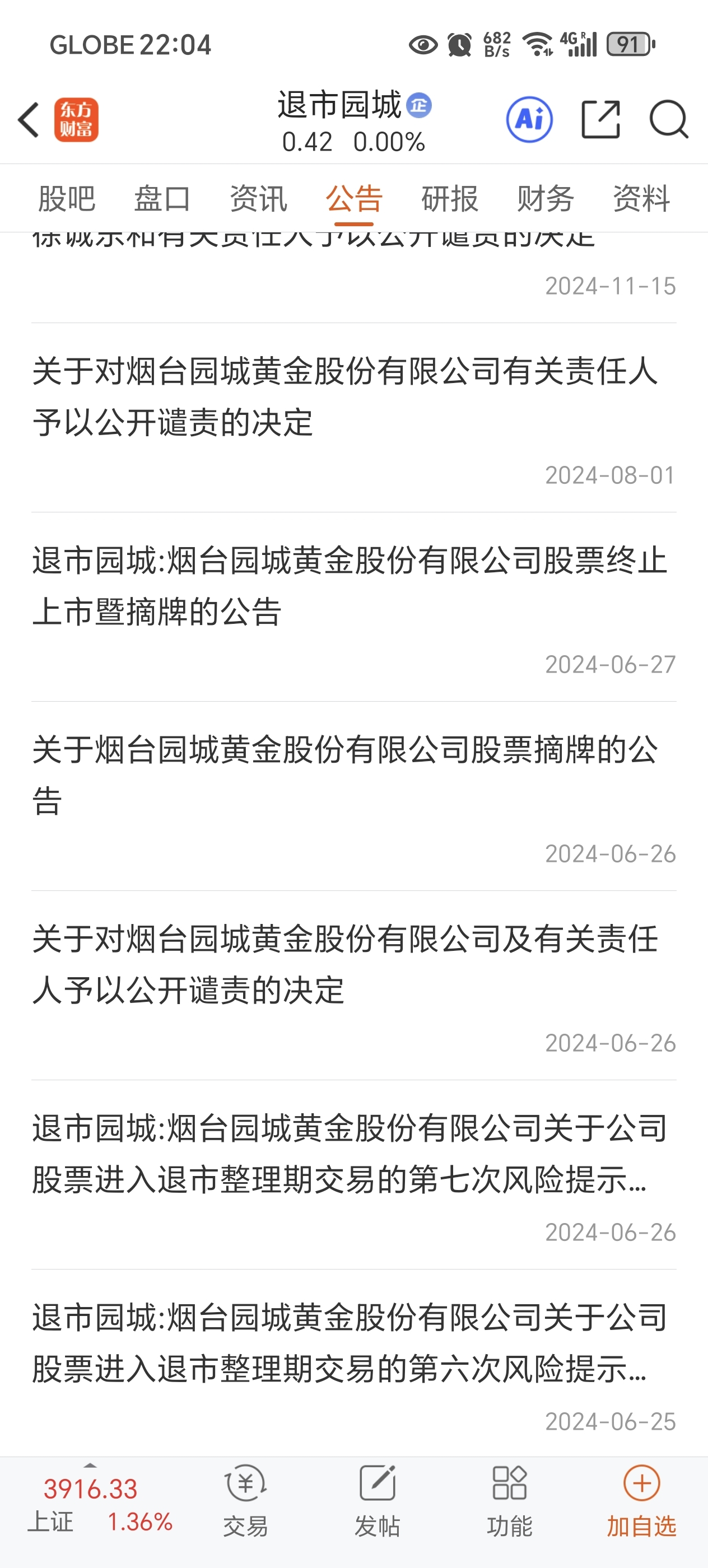 6月25日发第六次风险提示,6月26日第七次,6月27日退市,持有这个票的人可要想清楚了,退市前的一个礼拜或者两个礼拜都是一字板出不去的。退市整理期第一天就跌了94%多。