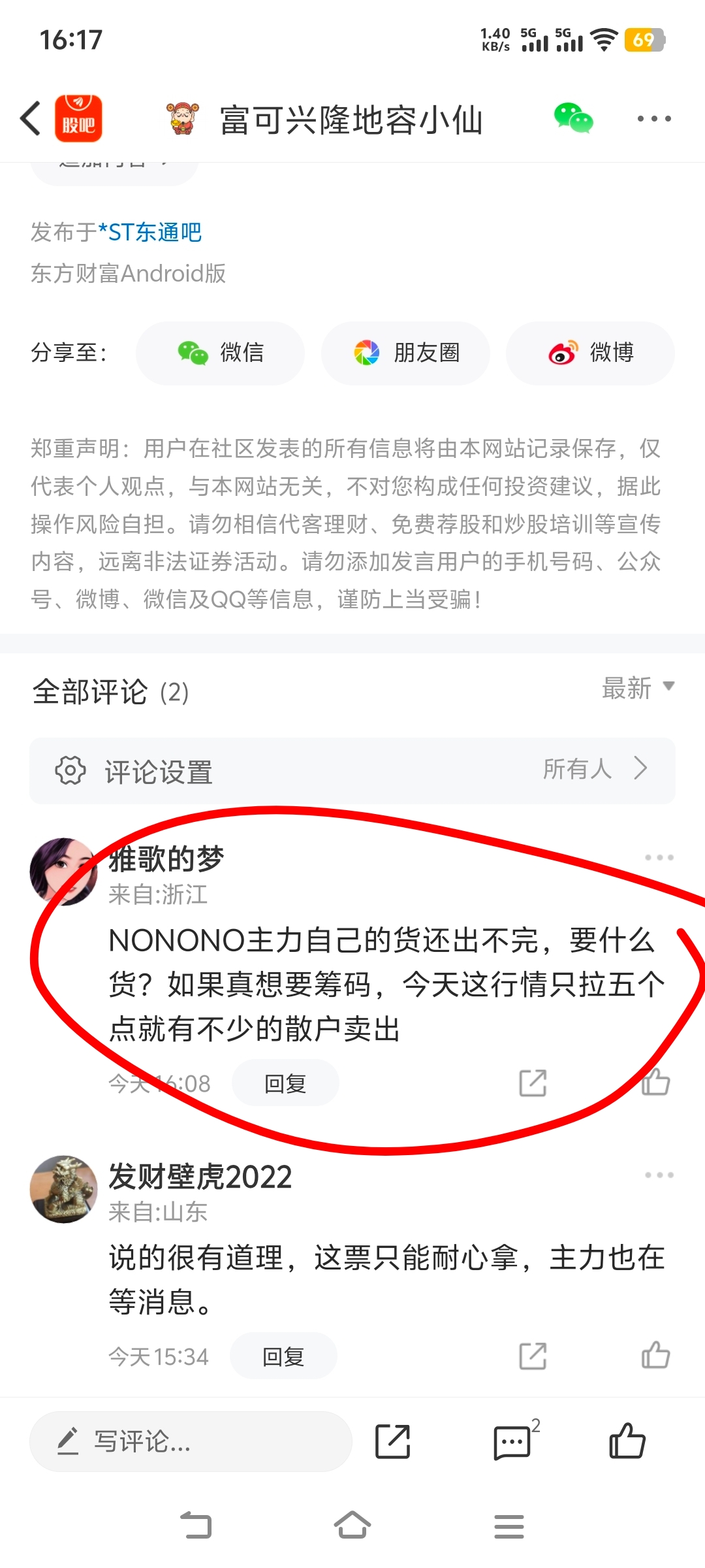 温馨提示: 1.根据《证券法》规定,禁止编造、传播虚假信息或者误导性信息,扰乱证券市场;2.用户在本社区发表的所有资料、言论等仅代表个人观点,与本网站立场无关,不对您构成任何投资建议。用户应基于自己的独立判断,自行决定证券投资并承担相应风险。《东方财富社区管理规定》