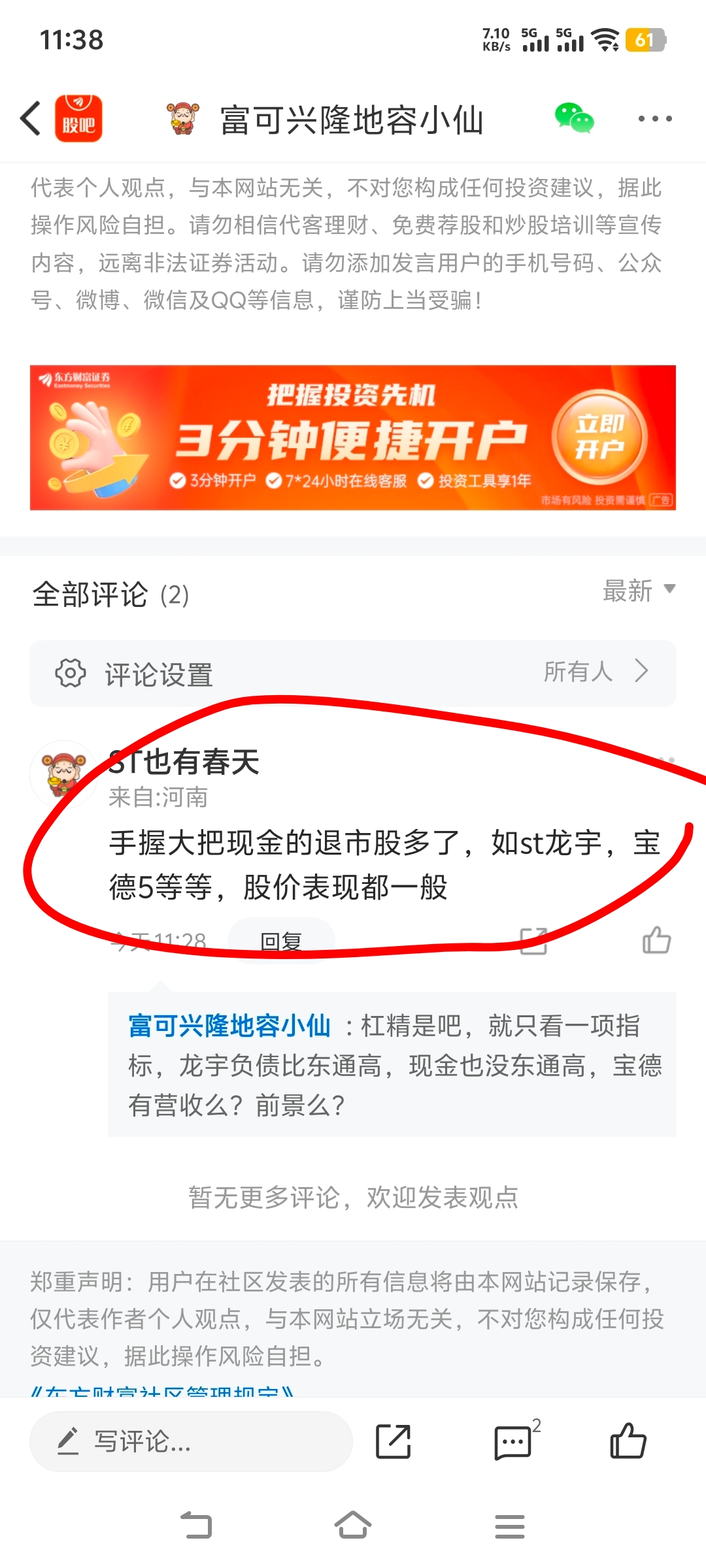 $*ST东通(SZ300379)$ 哪都有这种不带脑子的杠精,评价一个上市公司要看综合指标,光有现金没营收那不是扯,有的现金是不少负债还多呢,东通随便去找退市股里,现金多,负债低,前景非常高的科技股,夕阳产业跟未来热门产业能一样么?杠精们哪凉快哪去吧