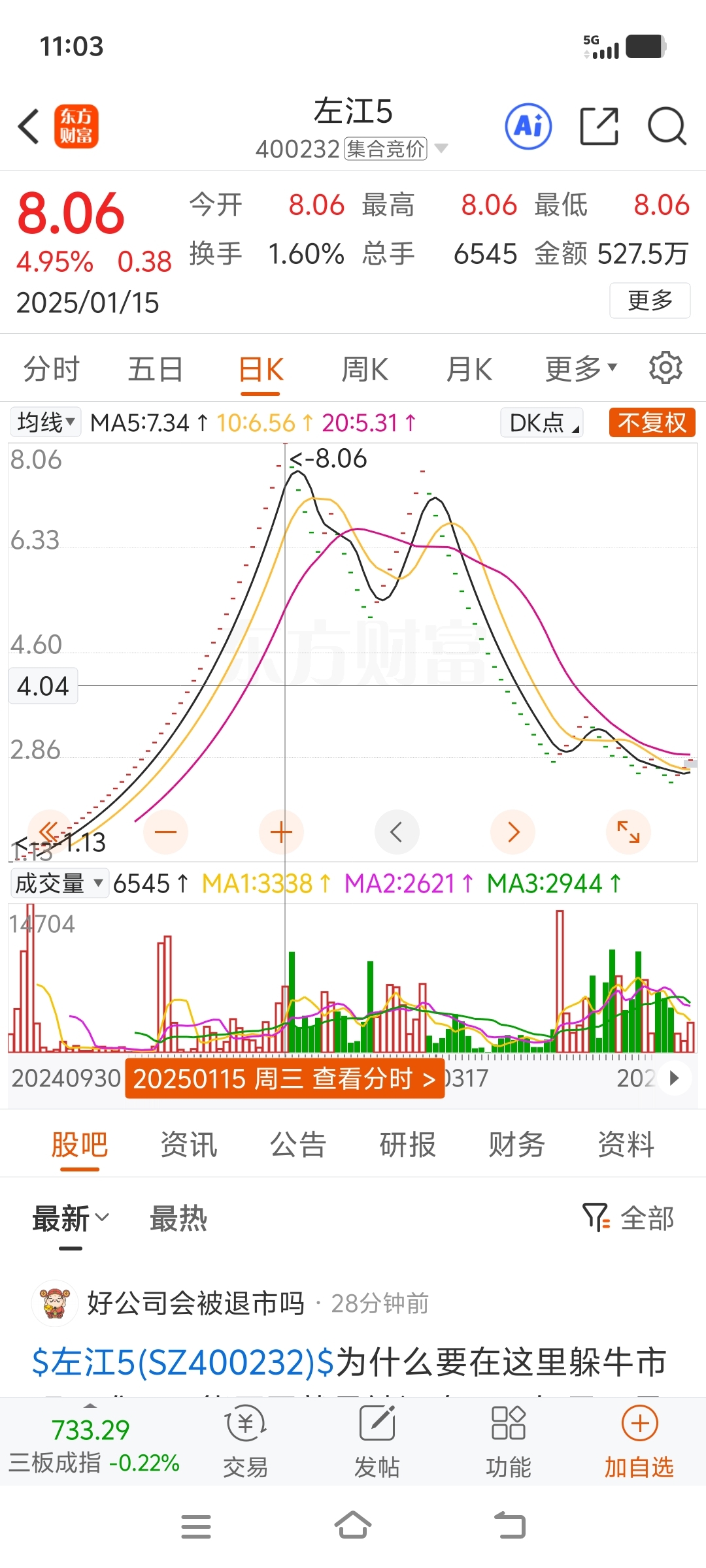 $*ST东通(SZ300379)$ 我真的想去三板,怎么还不停牌?但是我要买在正式结束交易之前的时候再买,那时候几毛钱,成本超低。看看左江退市后的走势吧,在哪里都是交易,这个肯定也是暴涨。