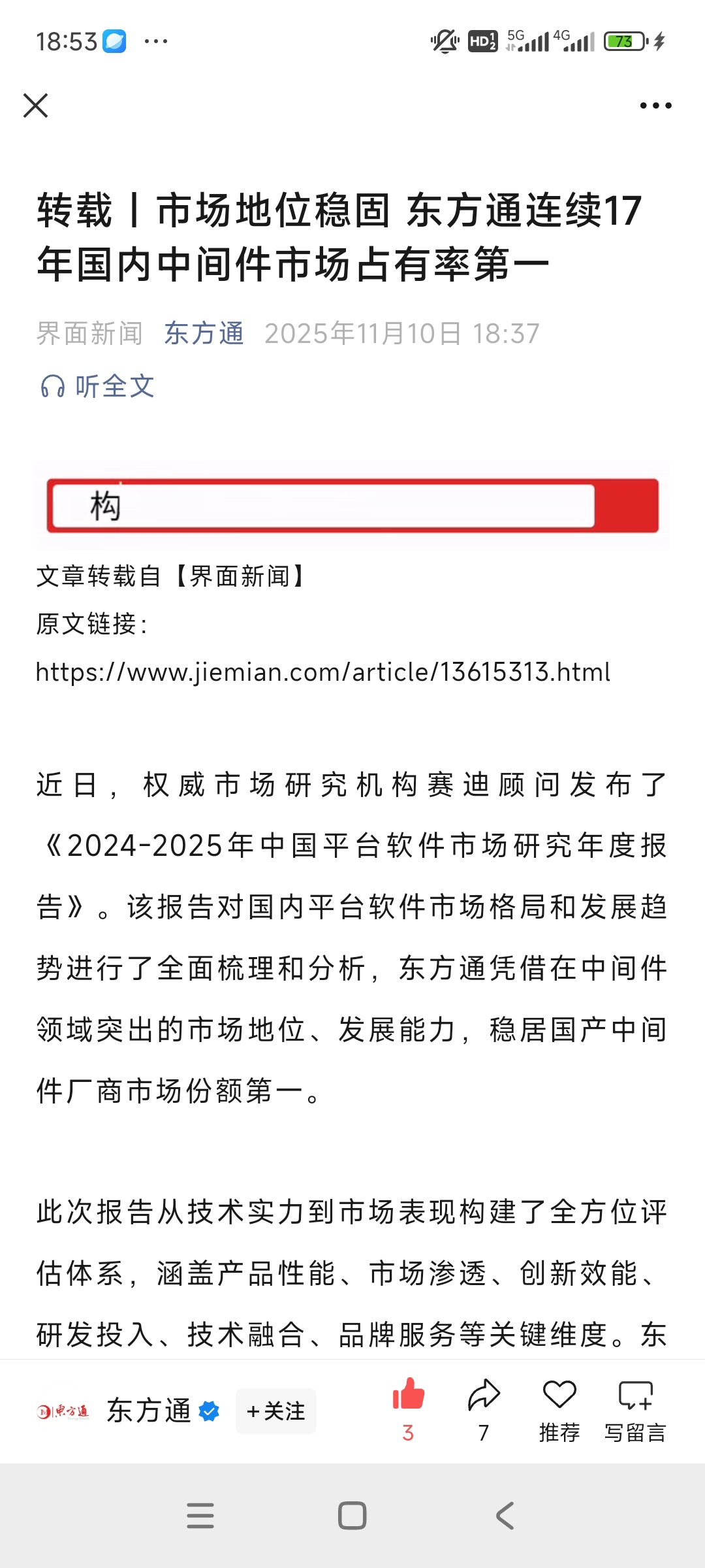 $*ST东通(SZ300379)$ 中间件全国第一,连续30年,难得啊!