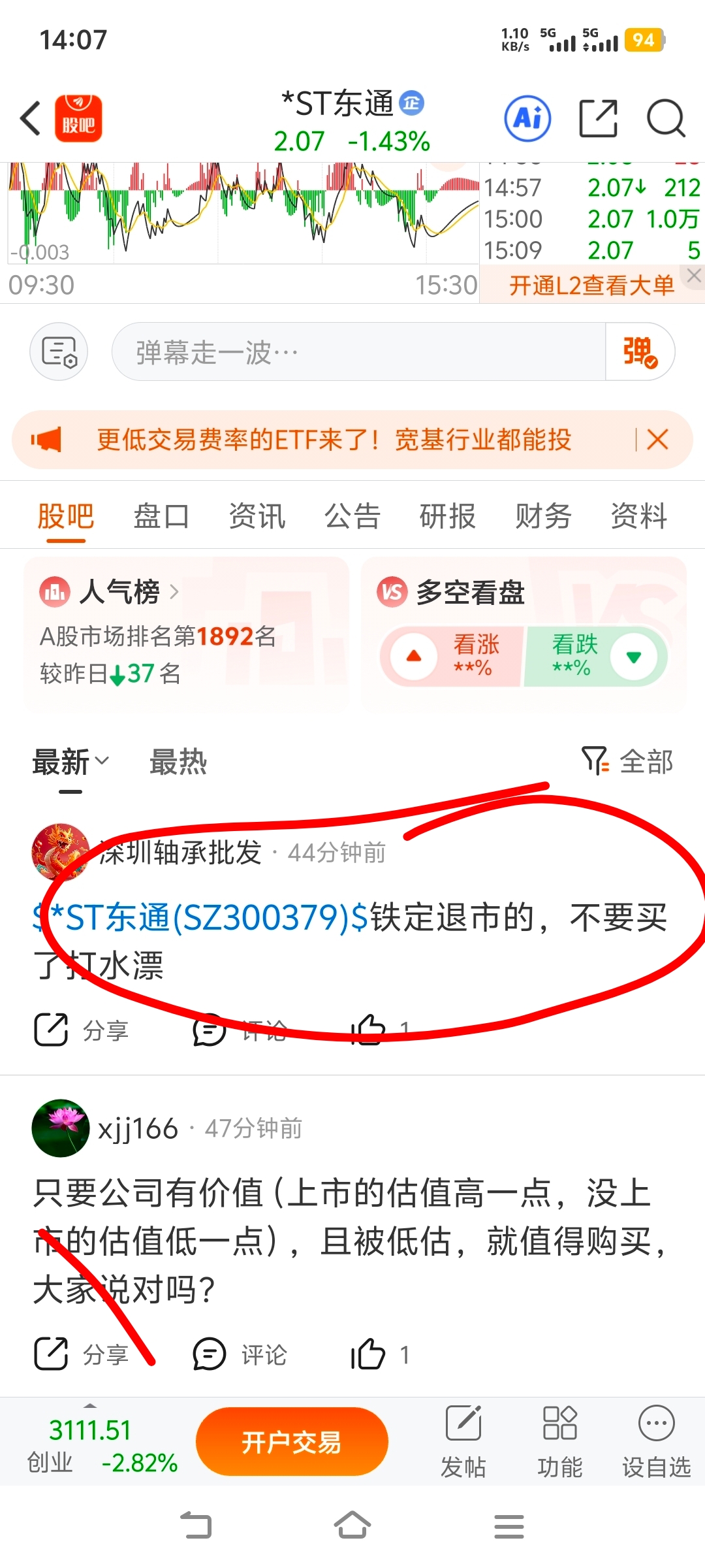 $*ST东通(SZ300379)$ 都亏成够了还来东通指点江山,2.1的本就是退市我都未必能亏30个点,不退市十倍,退市也就整理期头一天有可能跌点后边就得拉回来,你买的所谓的正股不应该挣么?咋也亏这么多,我要是你早就不发贴闭嘴了,怎么有脸出来指点江山的
