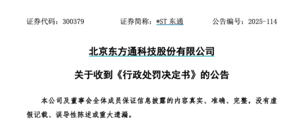 11月25日晚,*ST东通发布《关于收到行政处罚决定书的公告》及《关于公司股票停牌暨可能被终止上市的风险提示公告》,确认公司因长期系统性财务造假及欺诈发行,收到中国证券监督管理委员会北京监管局《行政处罚决定书》。