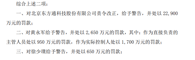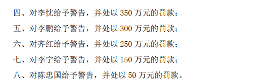 对时任财务总监、董秘徐少璞等其他直接责任人员分别处以50万元至650万元不等的罚款。
