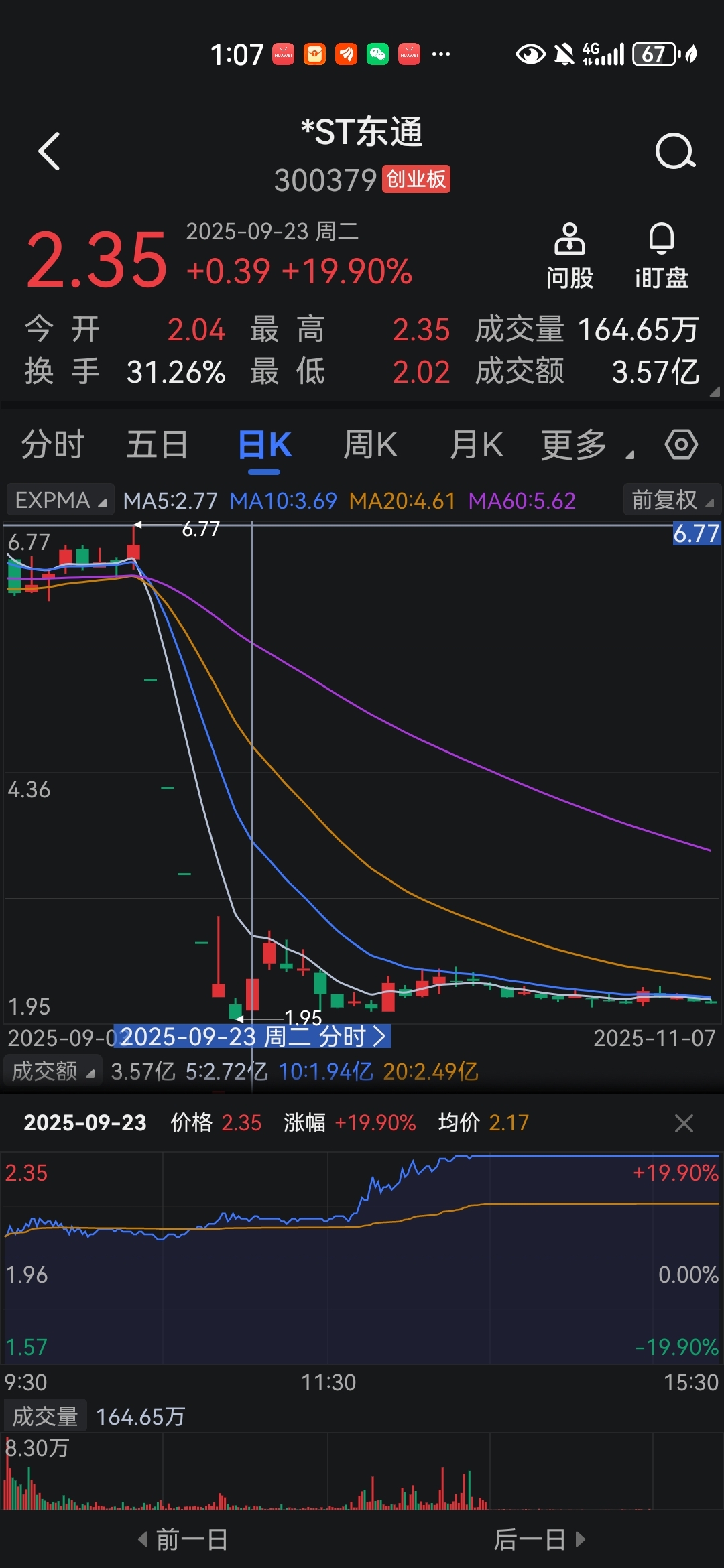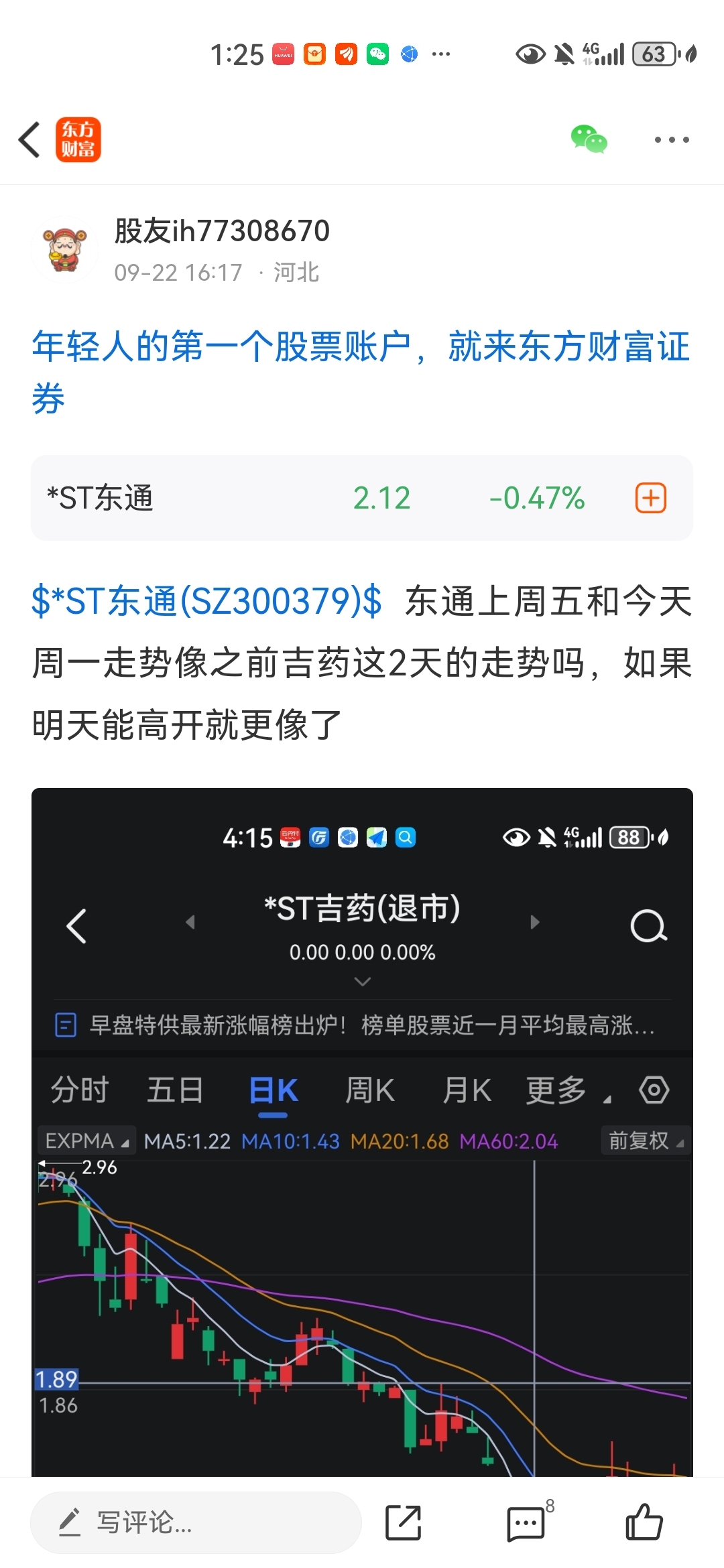 $*ST东通(SZ300379)$ 还记得9月22号也是东通发帖,我说和之前的吉药很像的,如果认真看了,是不是9月23号东通开始涨停了,现在东通停牌了,我又发帖说感觉和之前金刚退市走势很像,退市前一天都是大涨的,退市整理期会不会也都回来了,有时间可以仔细研究下金刚的走势