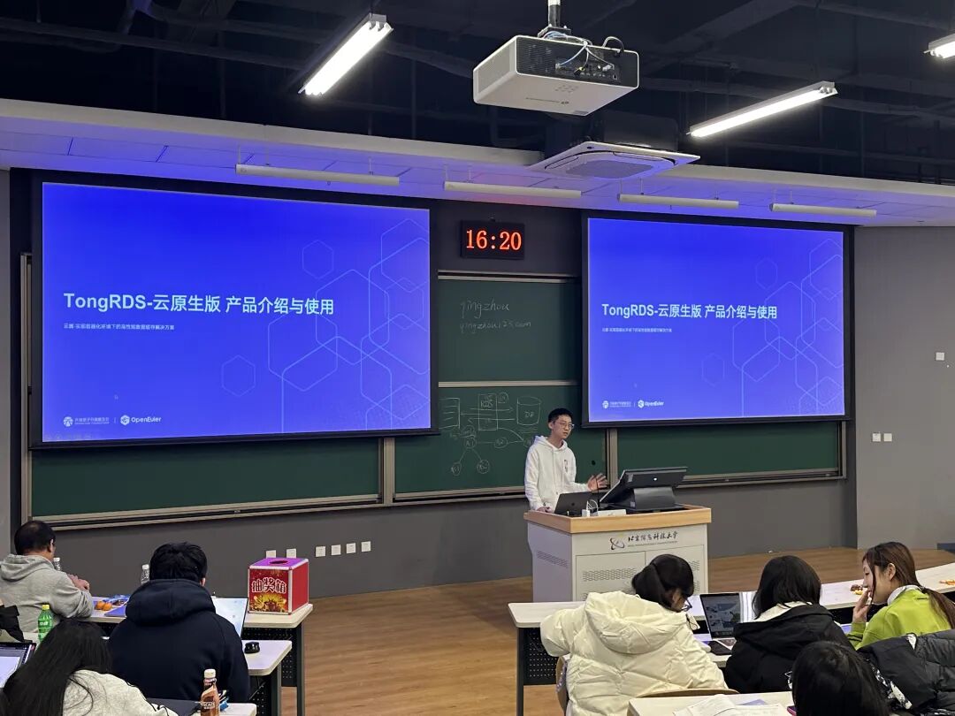 openEuler社区云翼项目Committer李东升带来TongRDS分布式缓存中间件相关分享。TongRDS是东方通自主研发的高性能多并发分布式数据缓存中间件,全面对标企业版Redis,数据存储于内存中,每秒可处理超10万次读写操作。李东升详细阐述了数据缓存中间件在Web加速、会话管理、热点数据缓冲等场景的核心价值,分析了缓存穿透、缓存雪崩、缓存击穿三大典型问题及解决方案。作为面向云原生架构设计的新一代产品,TongRDS具备自主技术架构与自主知识产权,拥有高性能、高可用、易于管理等优势,弹性伸缩能力和自动化运维水平大幅提升,可通过单机、主从、哨兵集群、集群等多种部署方式适配不同应用需求。随后,李东升还介绍了云翼开源项目的管理控制台功能、Gitee 代码仓库动态及开源开发任务,为师生展示了参与实际项目的实践路径。此外,现场还设置知识问答互动环节,针对缓存技术应用场景、典型问题解决方案等核心知识点展开交流,进一步深化学生理解,帮助师生构建起系统、完整的缓存技术知识体系。