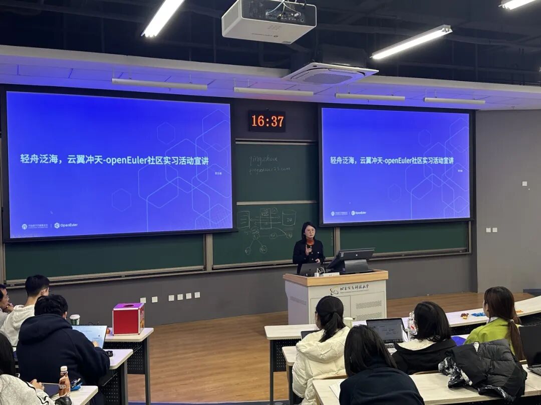 东方通生态发展部总经理李蕾在致辞中分享了openEuler社区发展成果,经过多年深耕,openEuler 社区已构建起完善的开源技术体系,汇聚了超2万名开发者,成为技术爱好者相互联动、课题研究、激发创新与实习实践的重要平台。作为社区重要贡献者,东方通始终坚持以多样化形式推动开源技术发展,更深知高校人才是开源生态的持续动力,本次活动既是技术分享平台,更是校企协同育人桥梁,东方通希望联动更多高校,让更多年轻开发者走进开源、参与开源,在社区实践中成长,共同为开源生态注入新生力量。