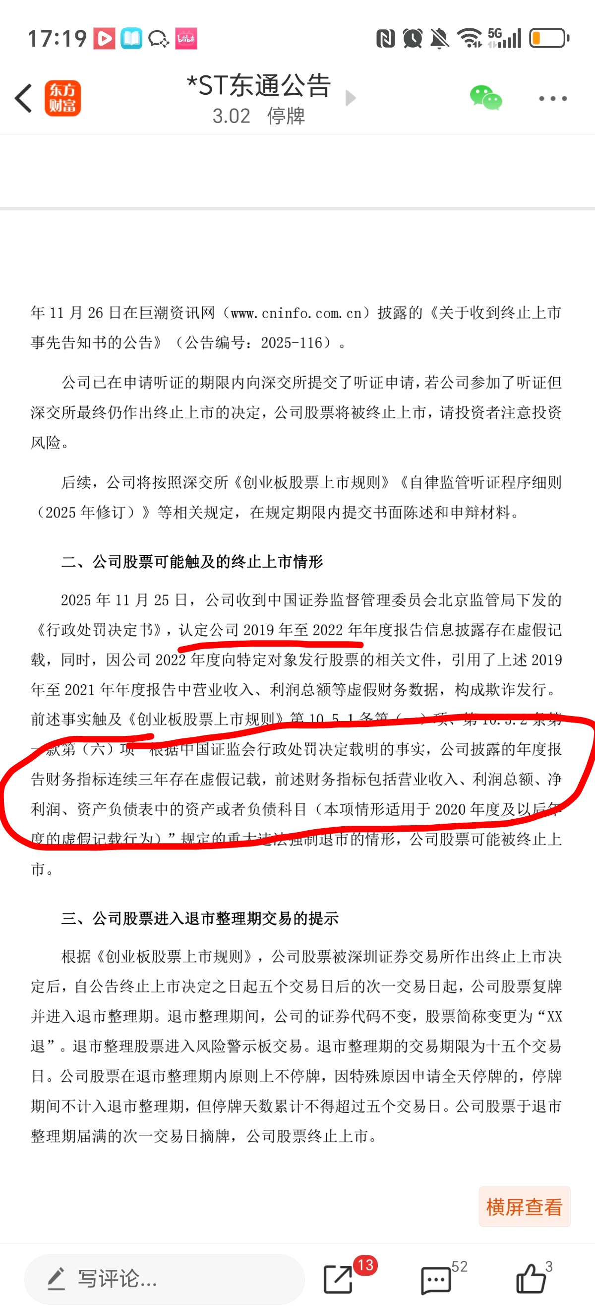 $*ST东通(SZ300379)$ 这把基本过了,法规只适用于3年不合规才在范围,2019年那就不算了,要从2020开始才算计入时间,两年的审计不合规,所以不构成法律红线,这把有好戏看了