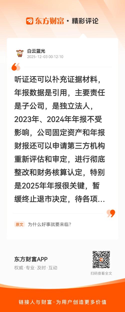 听证还可以䃼充证据材料,年报数据是引用,主要责任是子公司,是独立法人,2023年、2024年年报不受影响,公司固定资产和年报财报还可以申请第三方机构重新评估和审定,进行彻底整改和财务核算认定,特别是2025年年报很关键,暂缓终止退市决定,待各项数据进一步核实后,违法证据和事实进一步明确后,以理服人,惩戒和教育并行,让公司管理层和全体员工都得到教育,让股民心服口服!!!