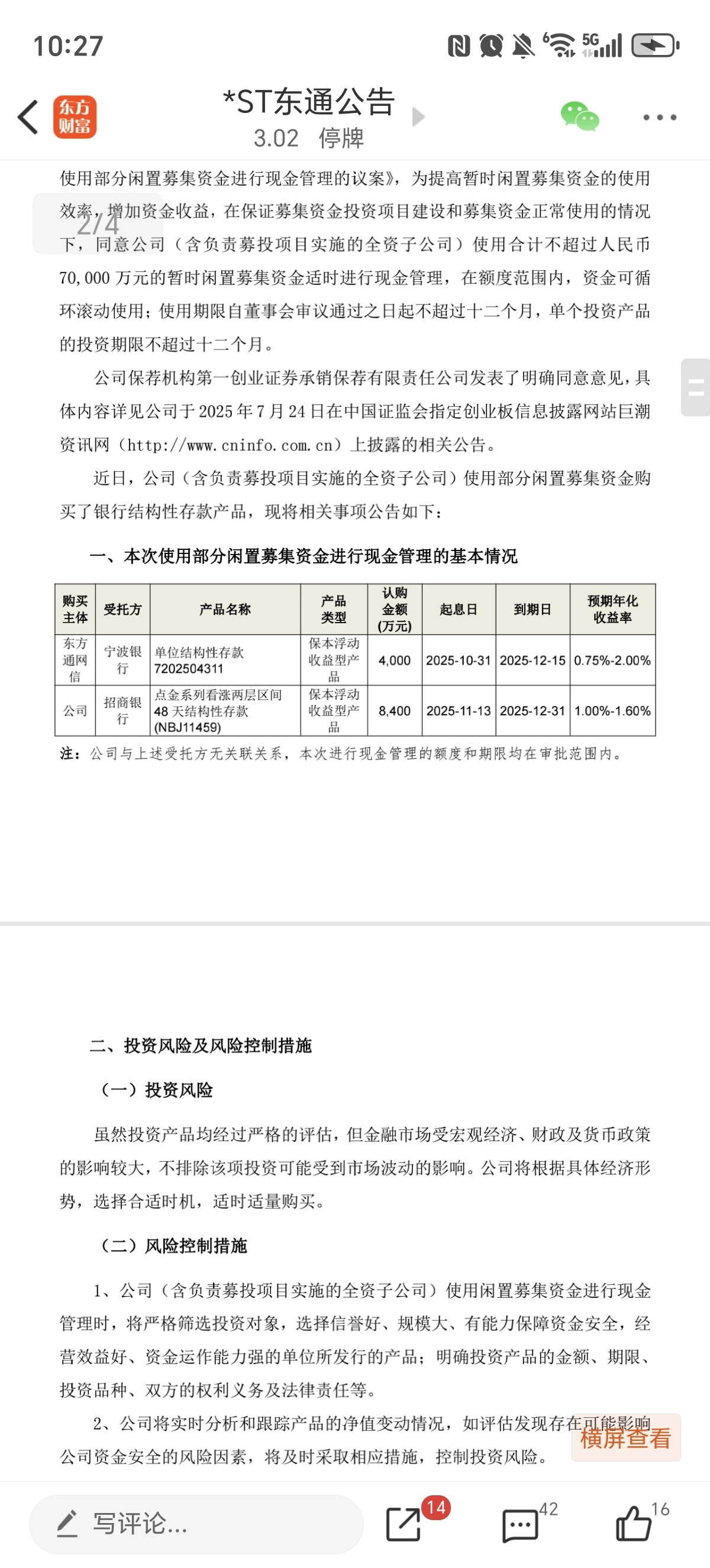 $*ST东通(SZ300379)$ 公司有一笔闲置资金在12月15号赎回,拿着这笔钱回购股票都可以直接救市了