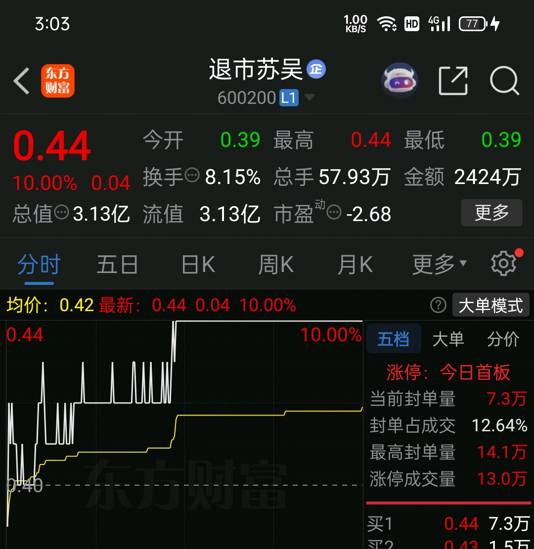 苏吴涨停板的走势,东方通退市整理期第一天是我要买一些套利,苏吴连续涨停的话,东方通,退市整理期第一天,最多下跌30%。摩尔线程上涨30%啦。3600亿啦。也是北京的,本公司也是北京的,都是科技龙头。