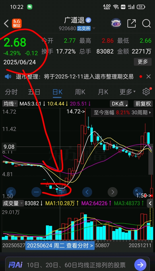都是科技公司,广道退市前6月24号最低价2.6元,6月25号,最低价2.4元,今