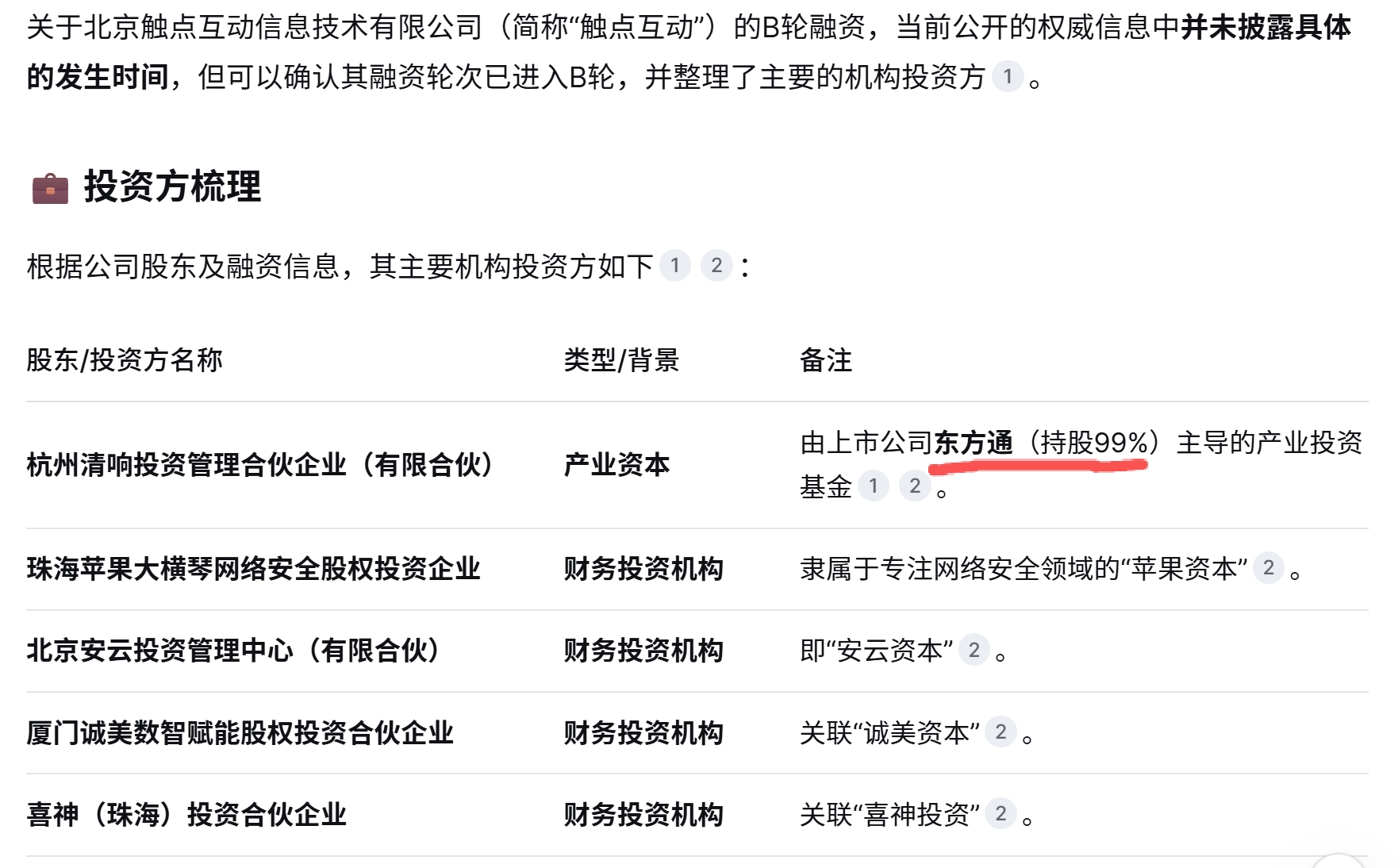 【分析讨论帖】不唱多也不唱空,理性分析由北京东方通科技股份有限公司控股的杭州清响投资管理合伙企业(有限合伙)这家投资公司的未来潜力。抛开目前东通退市与否,持股东通和想要持股东通的股东,应该更聚焦于东通未来的价值,我关注到杭州清响投资管理合伙企业(有限合伙)投资作为第二大股东的北京触点互动信息技术有限公司,其融资路径和相关股东的背景(国资背景)和行业地位,在网络安全领域,的确具有一定的潜力和地位。详细看股权结构图、业务范围和客户覆盖: