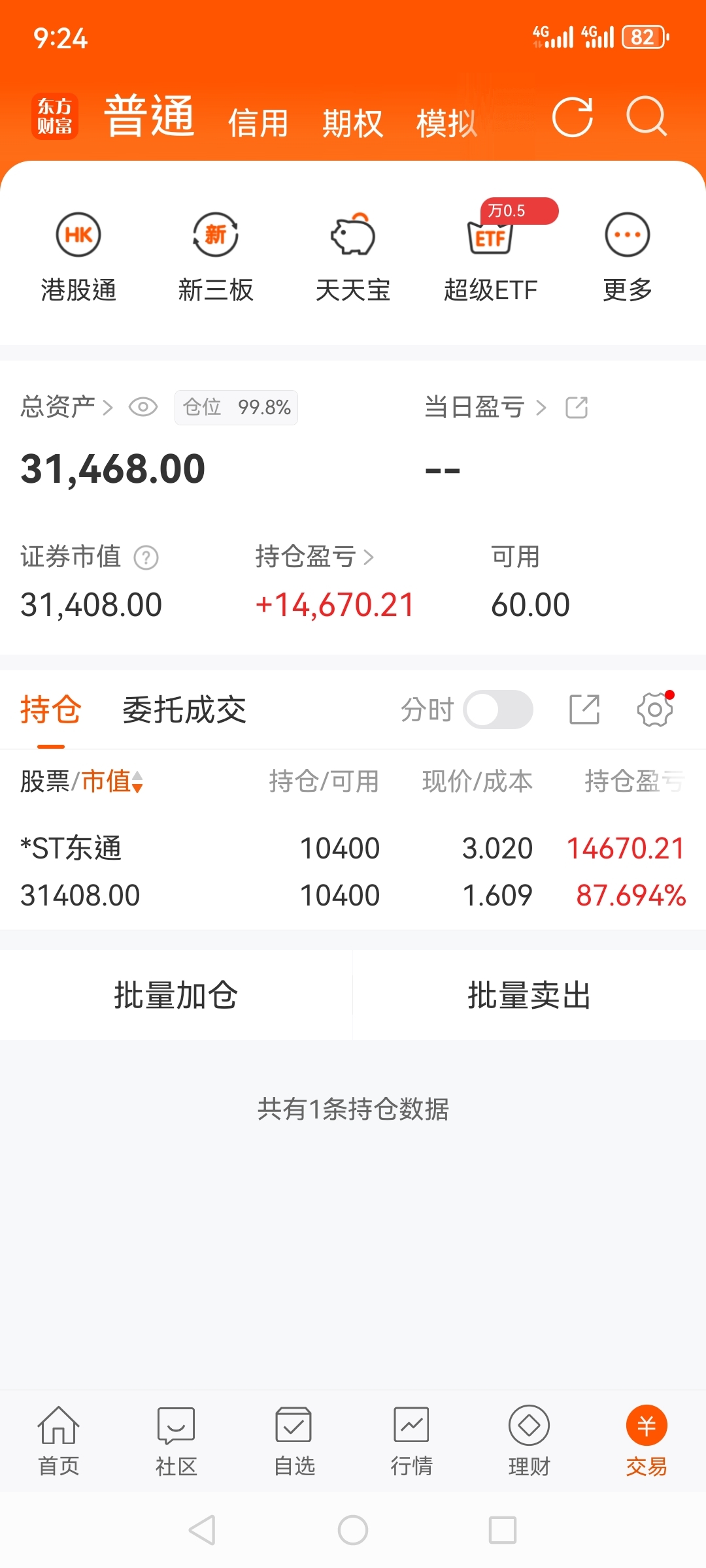 $*ST东通(SZ300379)$ 目前这只股我总共盈利27500,现在持股10400,31000多块钱,其实它跌到五毛我也不亏钱。所以说东通未曾负我。
