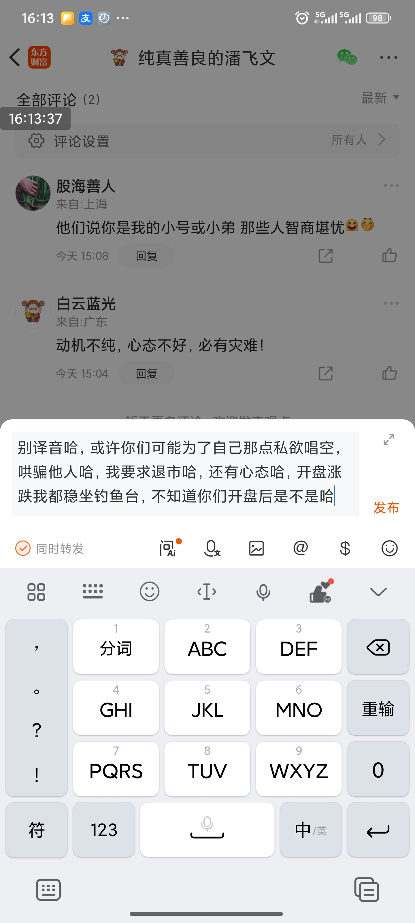 $*ST东通(SZ300379)$ 这个吧里牛鬼蛇神真的太多了,有的号一天发七八天动态,是怕人家看不出来是水军吗?基本的常识都没有,退市的话整理期,没有票的你也买不了,不退市的话你也买不到,到三板没有门票你也交易不了,到三板买卖很难,一天没有多少交易,只是小丑罢了,自认为是大神,可笑