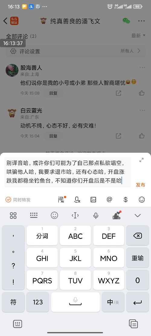 图片评论 //@纯真善良的潘飞文 :?没事哈?你操心自己就行哈,诉求就是退市哈//@纯真善良的潘飞文 :爱干嘛就干嘛哈,别的不必较真的哈,退市就行哈//@纯真善良的潘飞文 :在你家门口都没事哈,只要退市就行,剩下的不操心哈//@纯真善良的潘飞文 :你看看你们又天天译音别人唱空哈,天天译音别人是演员哈,//@纯真善良的潘飞文 :维护市场,做错必须收到惩罚?你说不是你左右的,谁叫你买的谁叫你卖的,赚钱了得瑟技术好,赔钱了说别人恶毒,全世界你家开...