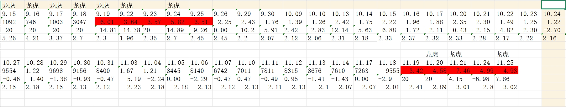 这四行分别是,日期是成交量,涨跌幅度,股票价格