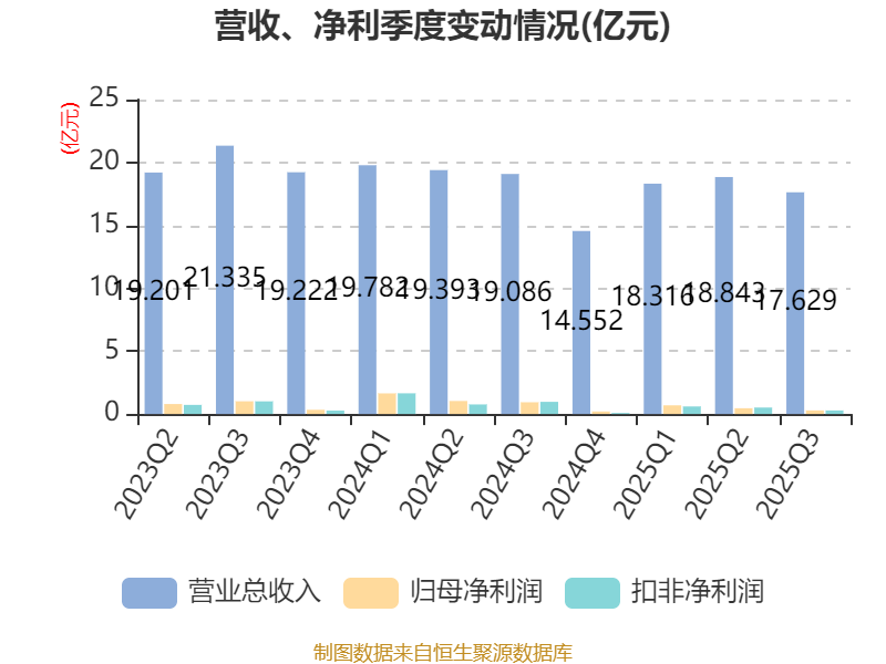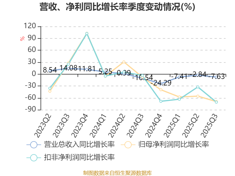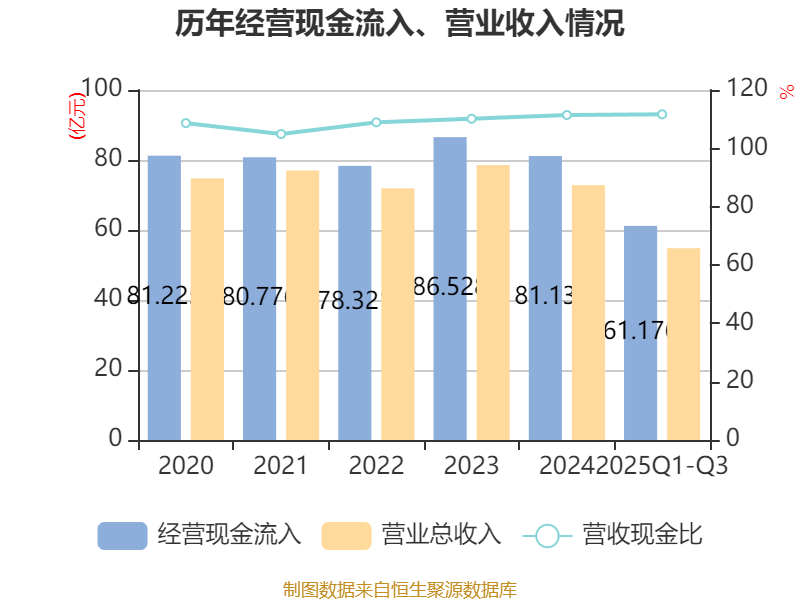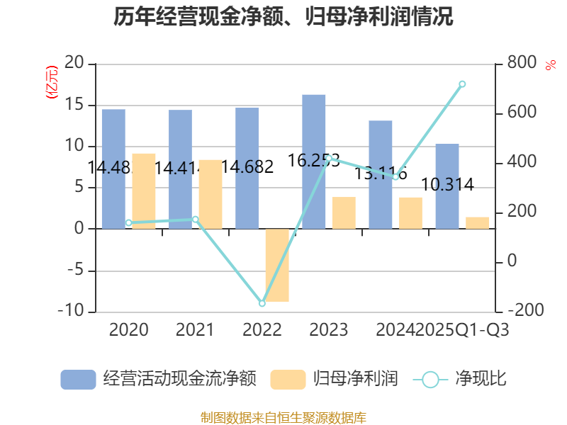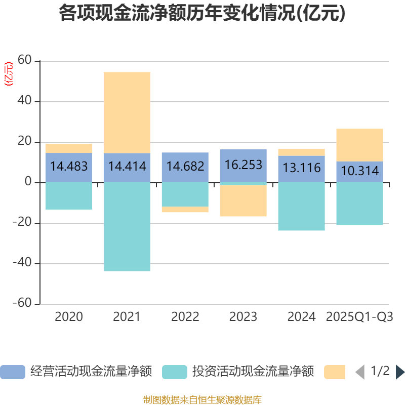 2025年前三季度,公司经营活动现金流净额为10.31亿元,同比增长2.02%;筹资活动现金流净额16.11亿元,同比增加15.82亿元;投资活动现金流净额-21.05亿元,上年同期为-19.37亿元。