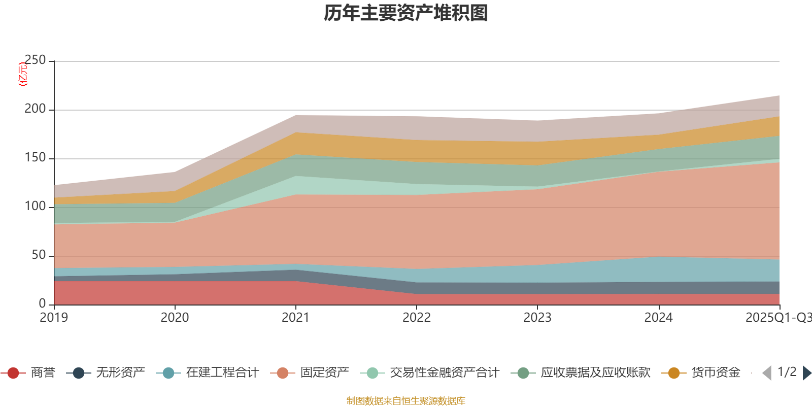资产重大变化方面,截至2025年三季度末,公司在建工程合计较上年末减少13.01%,占公司总资产比重下降2.7个百分点;固定资产较上年末增加14.38%,占公司总资产比重上升2.05个百分点;货币资金较上年末增加35.38%,占公司总资产比重上升1.79个百分点;交易性金融资产合计较上年末增加1393.31%,占公司总资产比重上升1.6个百分点。