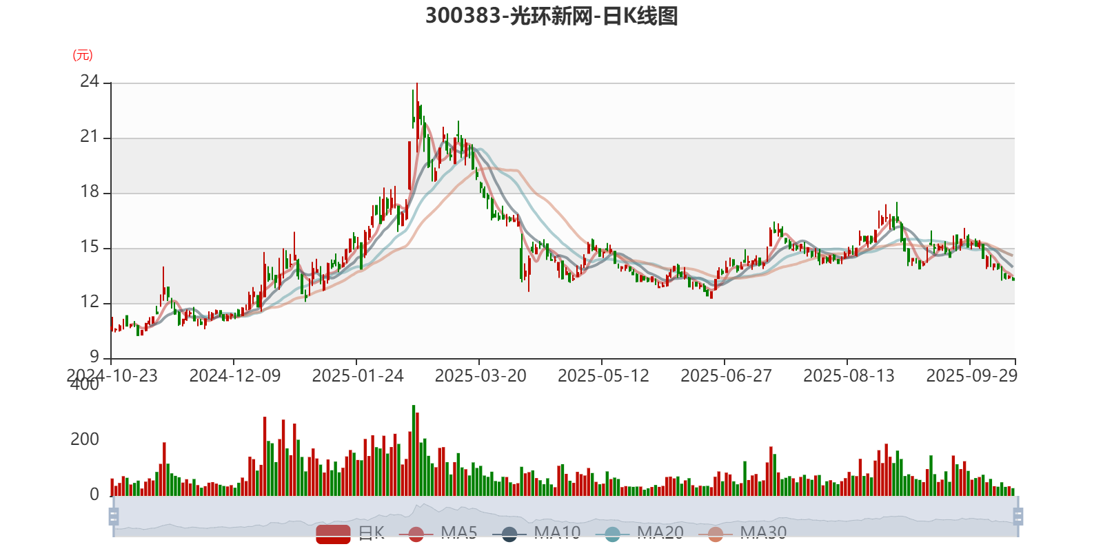 中证智能财讯光环新网(300383)10月23日披露2025年第三季度报告。前三季度公司实现营业总收入54.79亿元,同比下降5.96%;归母净利润1.44亿元,同比下降60.23%;扣非净利润1.4亿元,同比下降58.60%;经营活动产生的现金流量净额为10.31亿元,同比增长2.02%;报告期内,光环新网基本每股收益为0.08元,加权平均净资产收益率为1.13%。