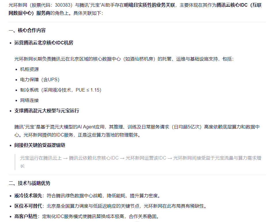 光环新网(股票代码:300383)与腾讯“元宝”AI助手主要体现在其作为腾讯云核心IDC(互联网数据中心)服务商的角色上。