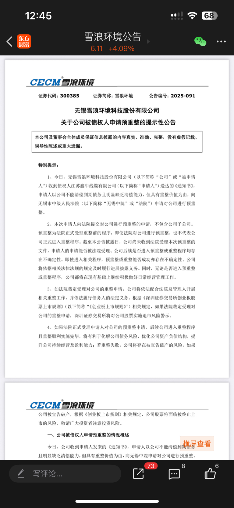 $雪浪环境(SZ300385)$ 11月19日申请预重整,流程一般就是一个月内出受理,目前还没有消息,我前面讲过了为什么