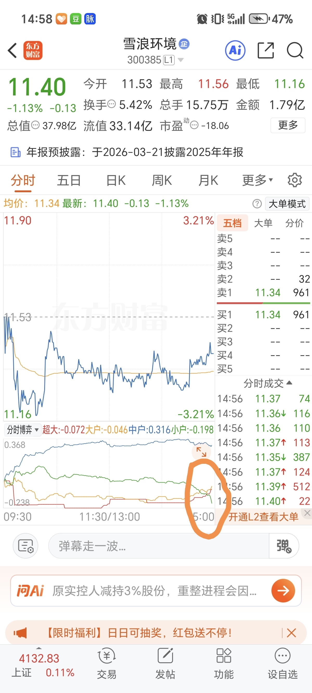 $雪浪环境(SZ300385)$ 昨天午盘主力集体抢筹,超大单、大单低位吸筹,洗盘短期见底,今天盘中有望提前反应,冲刺涨停,A股向来有提前炒作利好的逻辑。昨天没出公告,今明两天会出,胃口吊的很足,昨天尾盘进来的资金,今天开盘没理由不借题发挥一波。大家拭目以待吧!