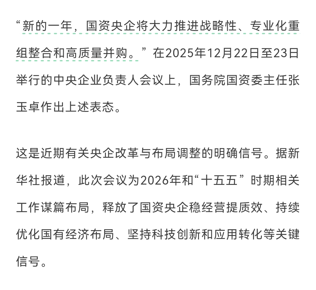 $节能国祯(SZ300388)$ “新的一年,国资央企将大力推进战略性、专业化重组整合和高质量并购。”在2025年12月22日至23日举行的中央企业负责人会议上,国务院国资委主任张玉卓作出上述表态。这是近期有关央企改革与布局调整的明确信号。据新华社报道,此次会议为2026年和“十五五”时期相关工作谋篇布局,释放了国资央企稳经营提质效、持续优化国有经济布局、坚持科技创新和应用转化等关键信号。