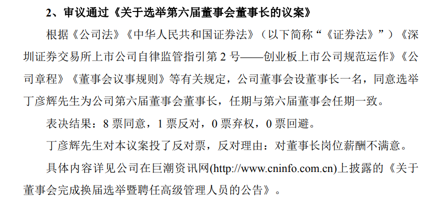 公告显示,该议案的表决结果为8票同意、1票反对、0票弃权、0票回避。而这唯一的反对票,来自丁彦辉本人,反对理由是“对董事长岗位薪酬不满意”。与此同时,艾比森本次会议的绝大多数议案均获得全票同意,无反对票。