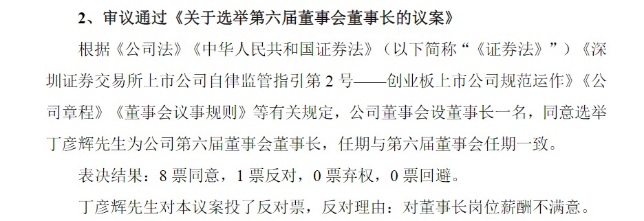 然而就在选举第六届董事会董事长的议案时,董事长丁彦辉却投出了唯一一张反对票。反对理由则十分具有戏剧性,理由是“对董事长岗位薪酬不满意”。
