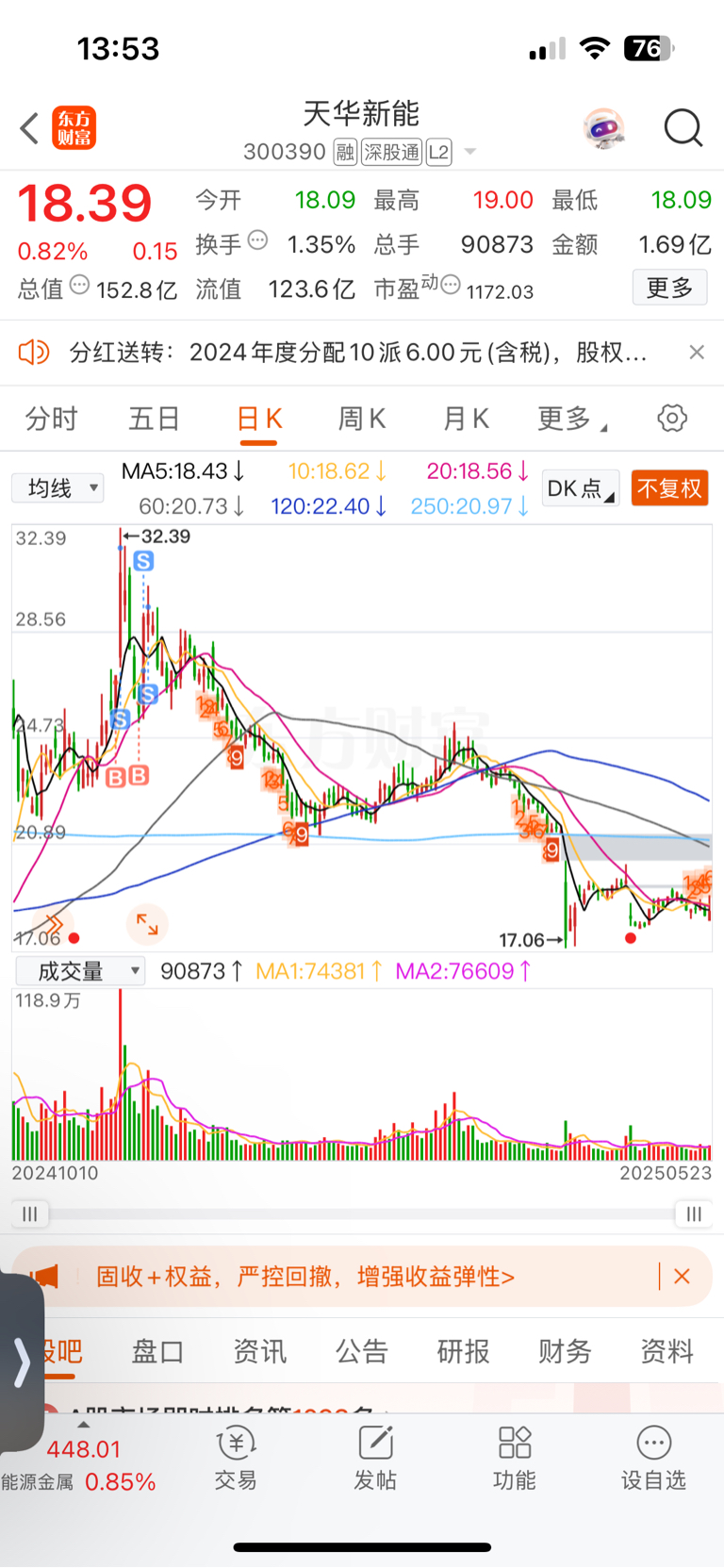 $天华新能(SZ300390)$ 跌这么多了,还好我赚了就跑