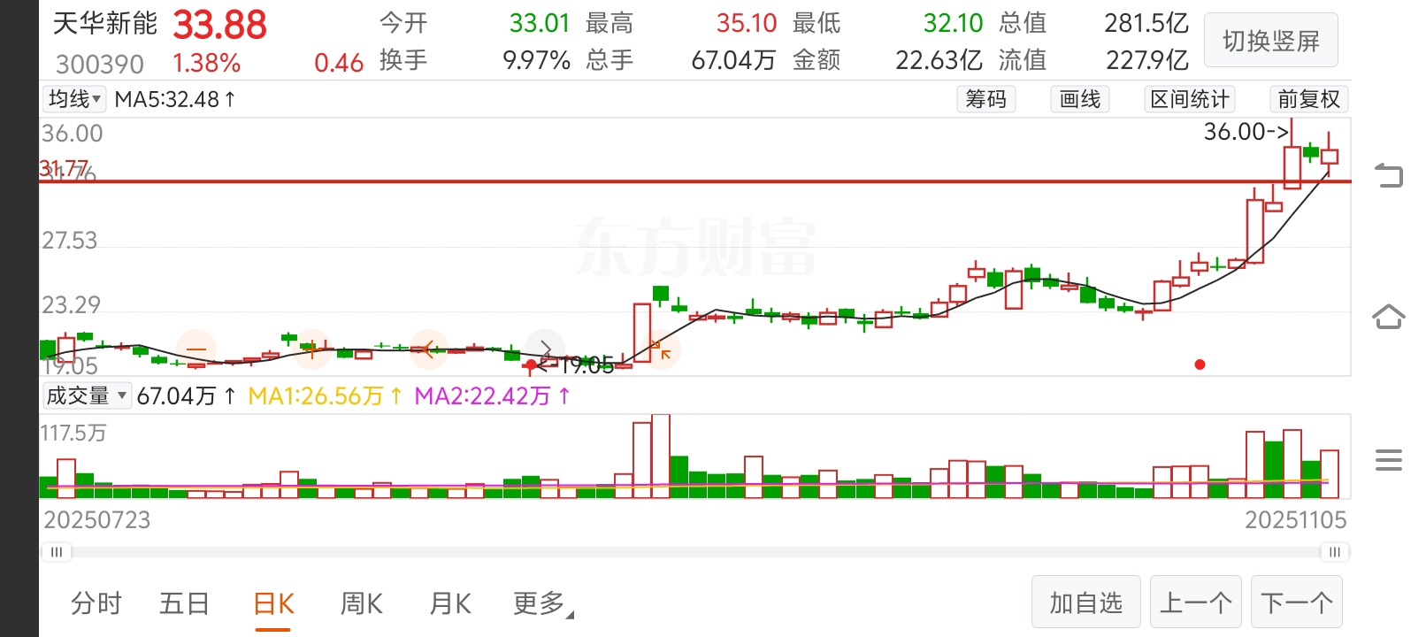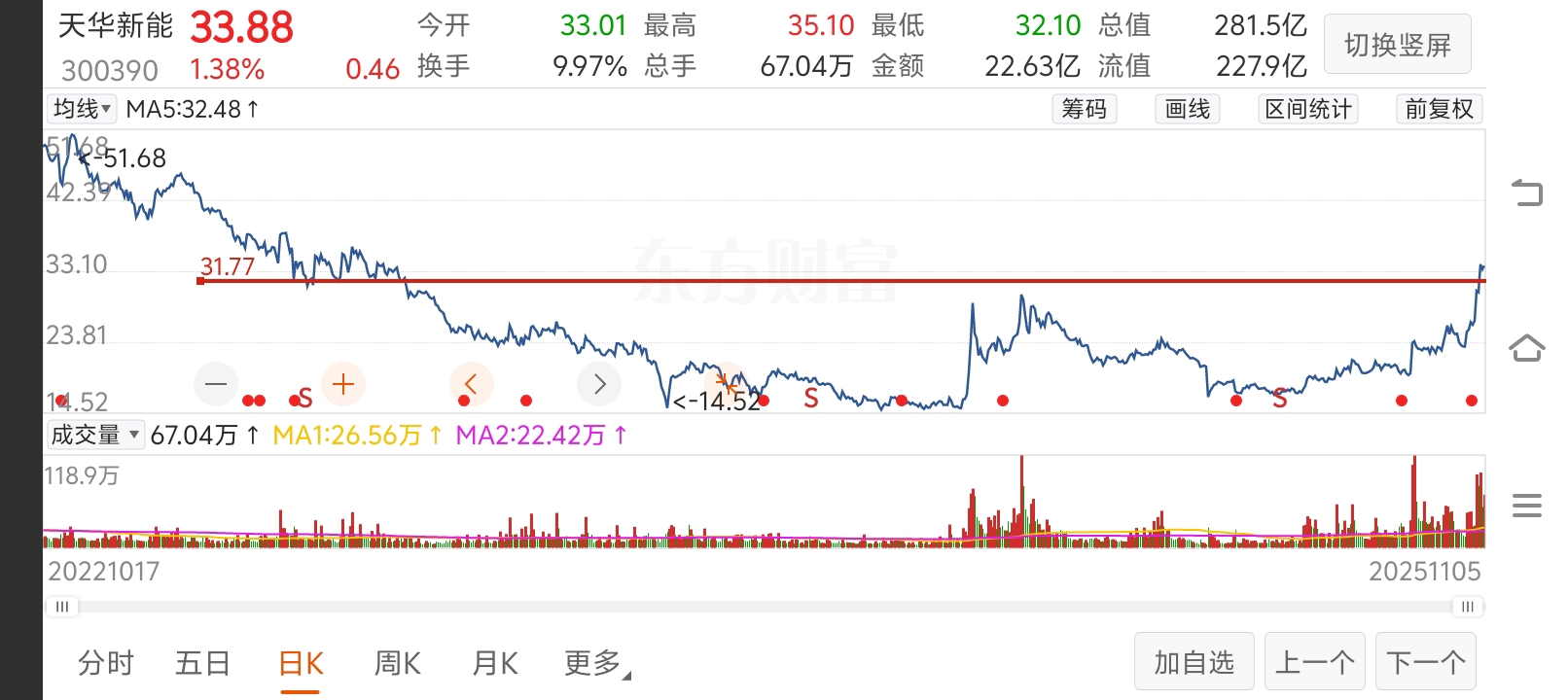 量能持续过牛熊分界线31.79元,回踩5日均线。买入!仓位分四次进入,总仓位不超