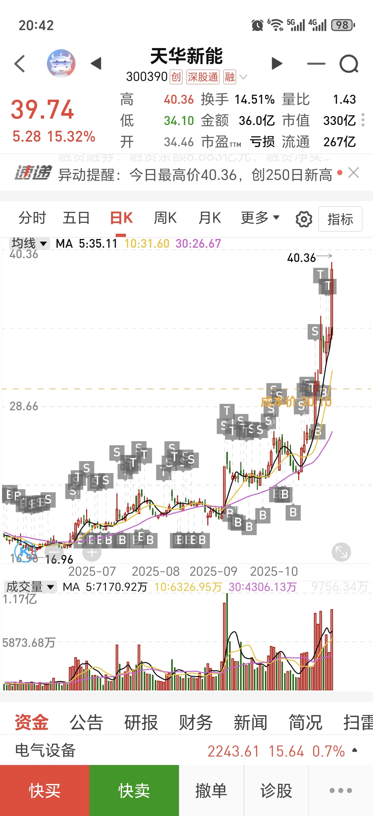 $天华新能(SZ300390)$ 捉了四年,均价26块被全部洗出去了4.3万股,然后34追高进了一些,做T后目前只有5000股。算了一下损失30万