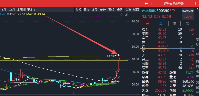 $天华新能(SZ300390)$ 天华新能,周线250线第一目标43元已经到了。后面看50了。