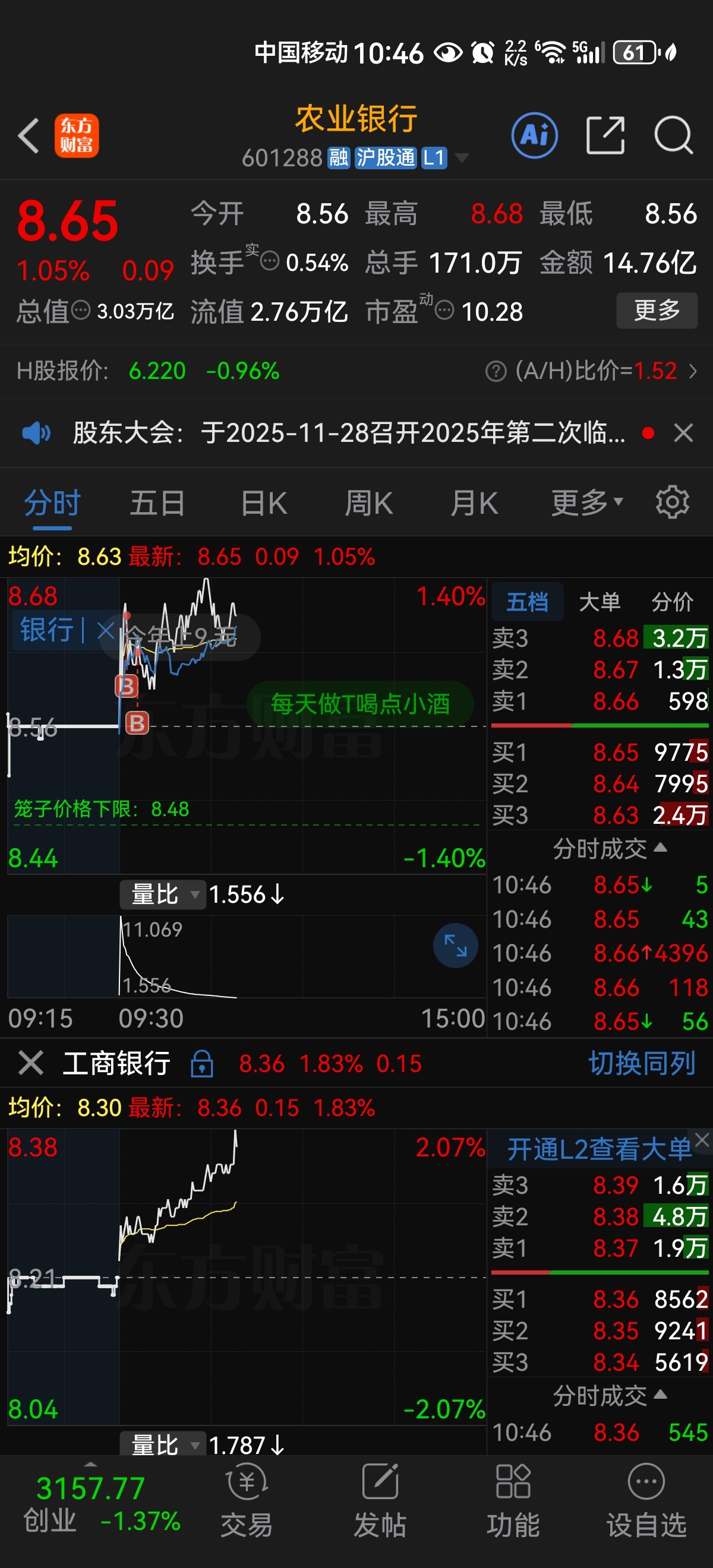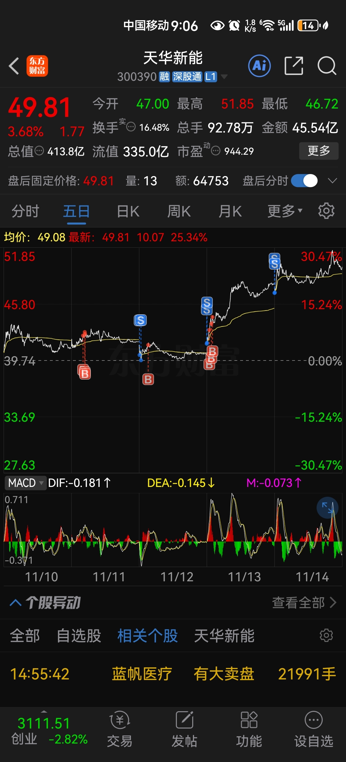 $天华新能(SZ300390)$ 本来亏1300多经过我追涨杀跌追涨杀跌再追涨今天天华新能又低开我直接竞价砸了!最终还赚了主力165块钱如果不动可以赚2000,可是没有如果这也是我第一次在一只票上待过3天,今天判断失误买了农业银行又亏2个点下周一割了!竞价买回天华新能,