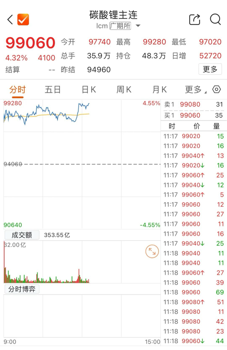 $天华新能(SZ300390)$ 好消息来啦:据Choice数据,广期所碳酸锂主力合约今日早盘继续上行,截至发稿报99060元/吨。在上周五大幅回调后,已经连续两日上涨。