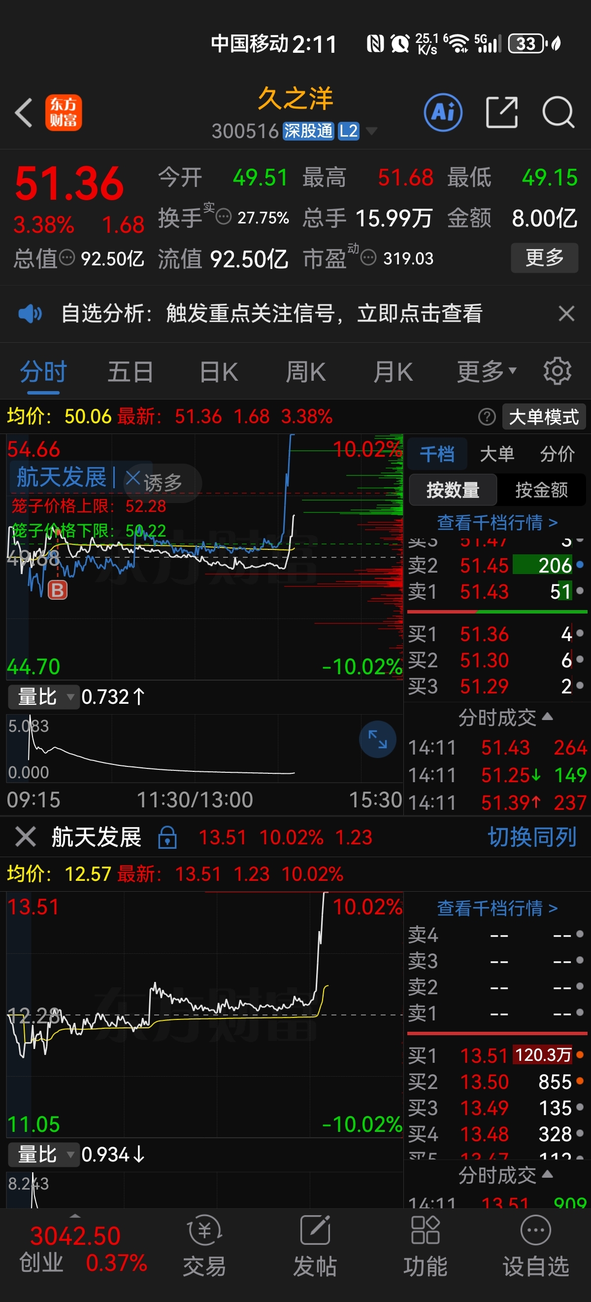 昨天追了锂电池天华新能,卫星通信商业航天久之洋,芯片半导体ETF。啊50暴涨星期
