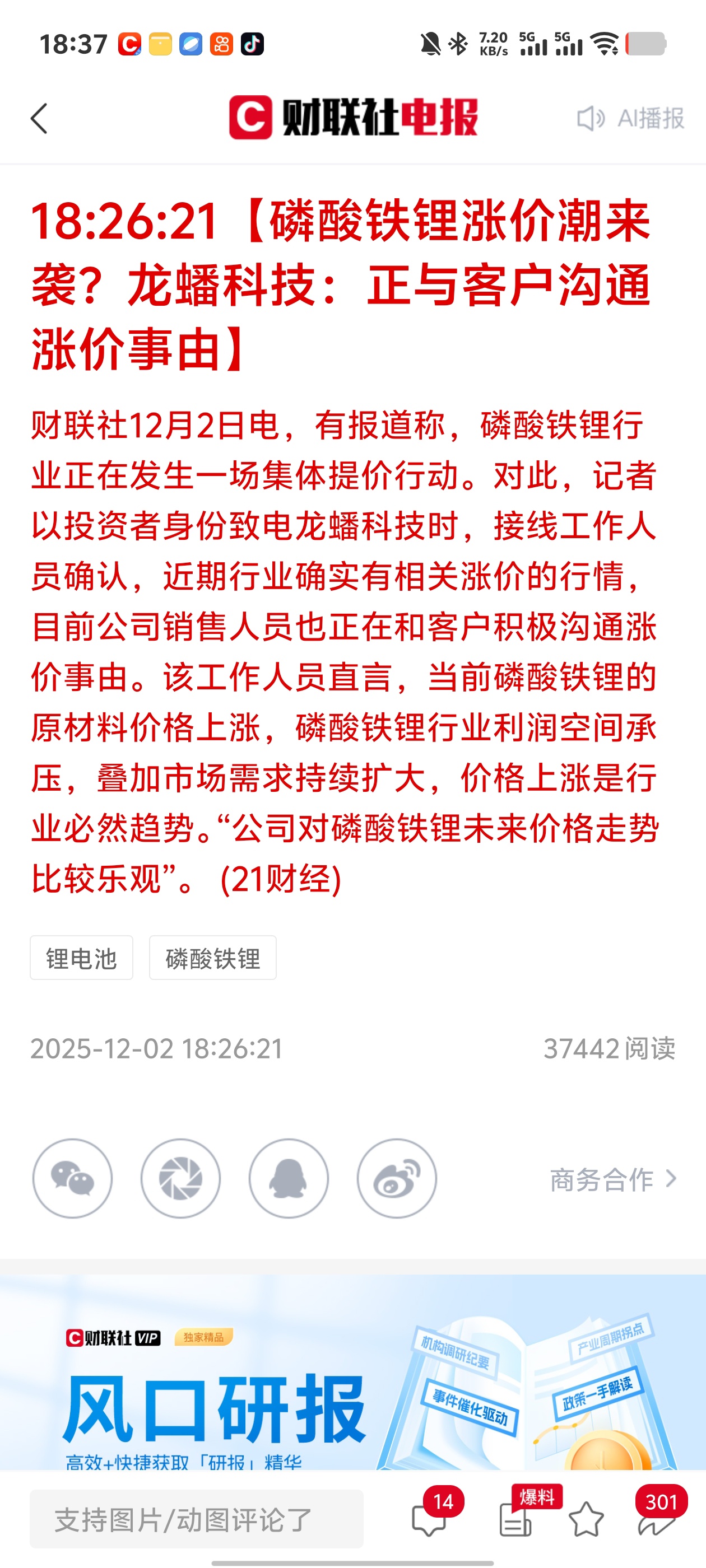 $天华新能(SZ300390)$ 磷酸锂涨价是趋势,好好拿着吧