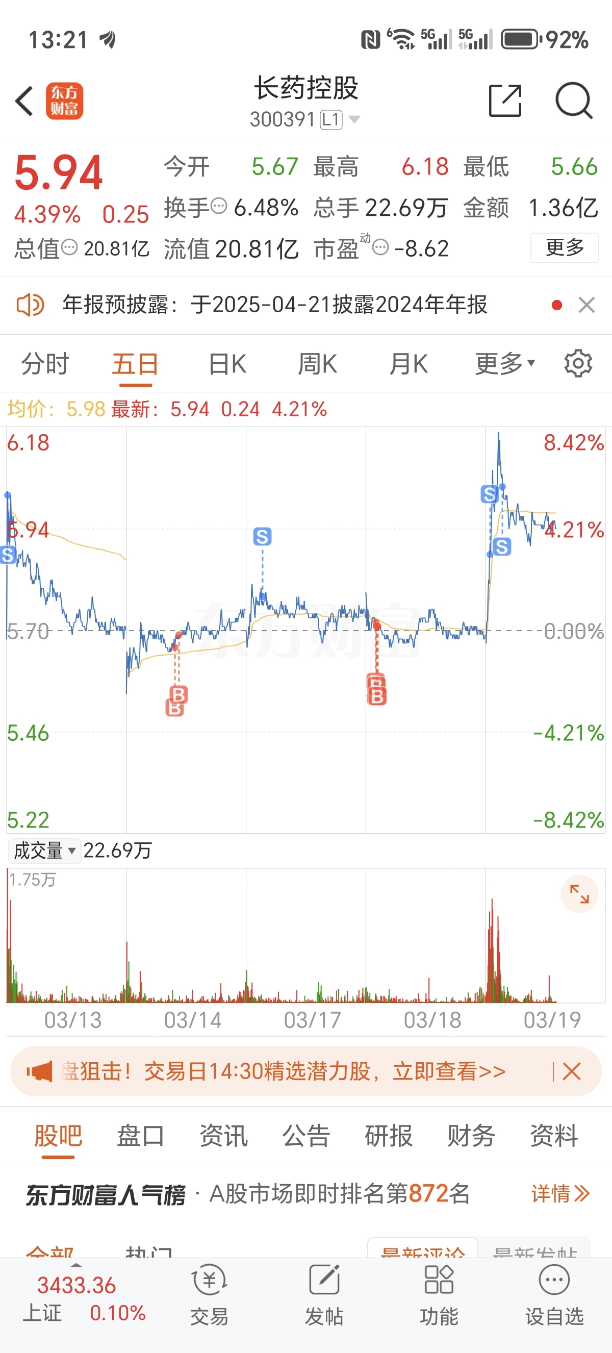 $长药控股(SZ300391)$ 哎,这个股只能赚个盒饭钱,不能吃多,吃多了就容易噎死