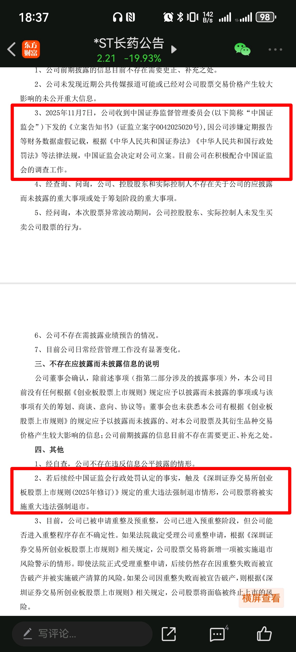 $*ST长药(SZ300391)$ 现在没有把退市警示放在跟立案调查描述一起并加粗了!看来打电话还是有效果!