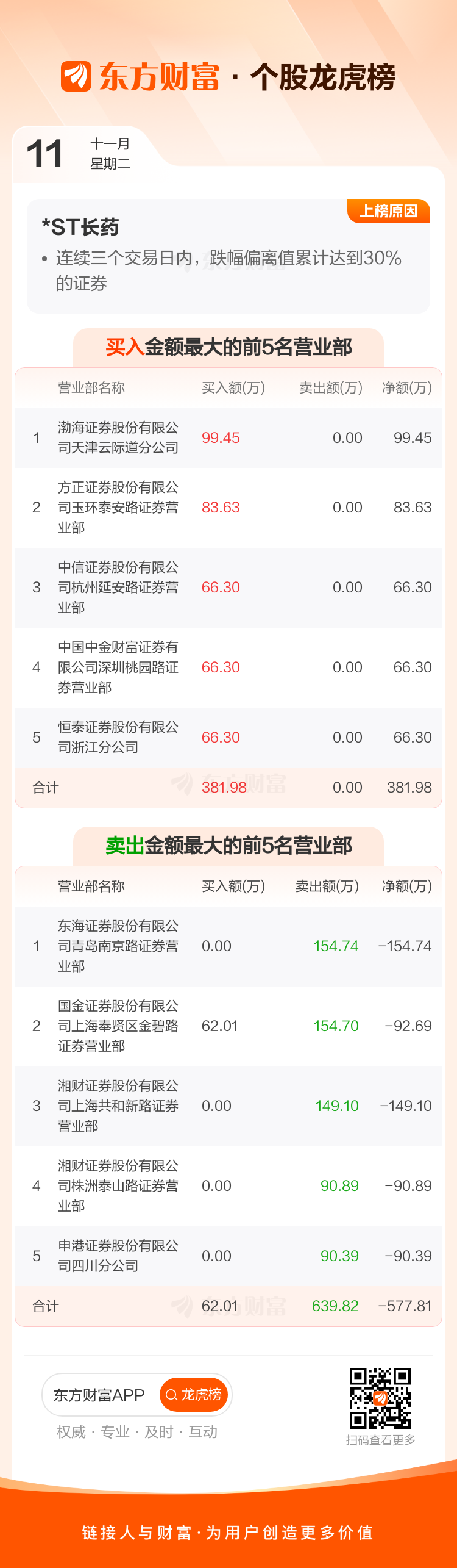 交易所2025年11月11日公布的交易公开信息显示,*ST长药因成为日跌幅达到15%的前5只证券、连续三个交易日内,跌幅偏离值累计达到30%的证券上榜。*ST长药当日收报2.21元,涨跌幅-19.93%,偏离值-20.00%,换手率2.06%,成交额1594.60万。异常期间11月10日至11月11日,期间涨幅-35.94%,累计偏离值-34.98%,区间成交额2140.26万。