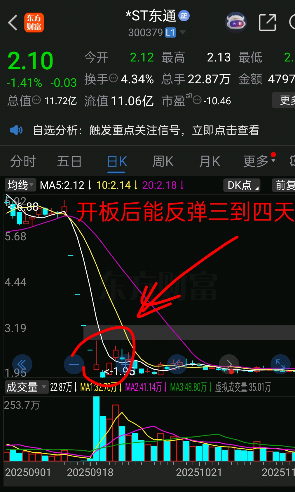 如下图。正确分析。20厘米连续跌停的,开板后能,反弹三到四天,本公司流通盘更小,